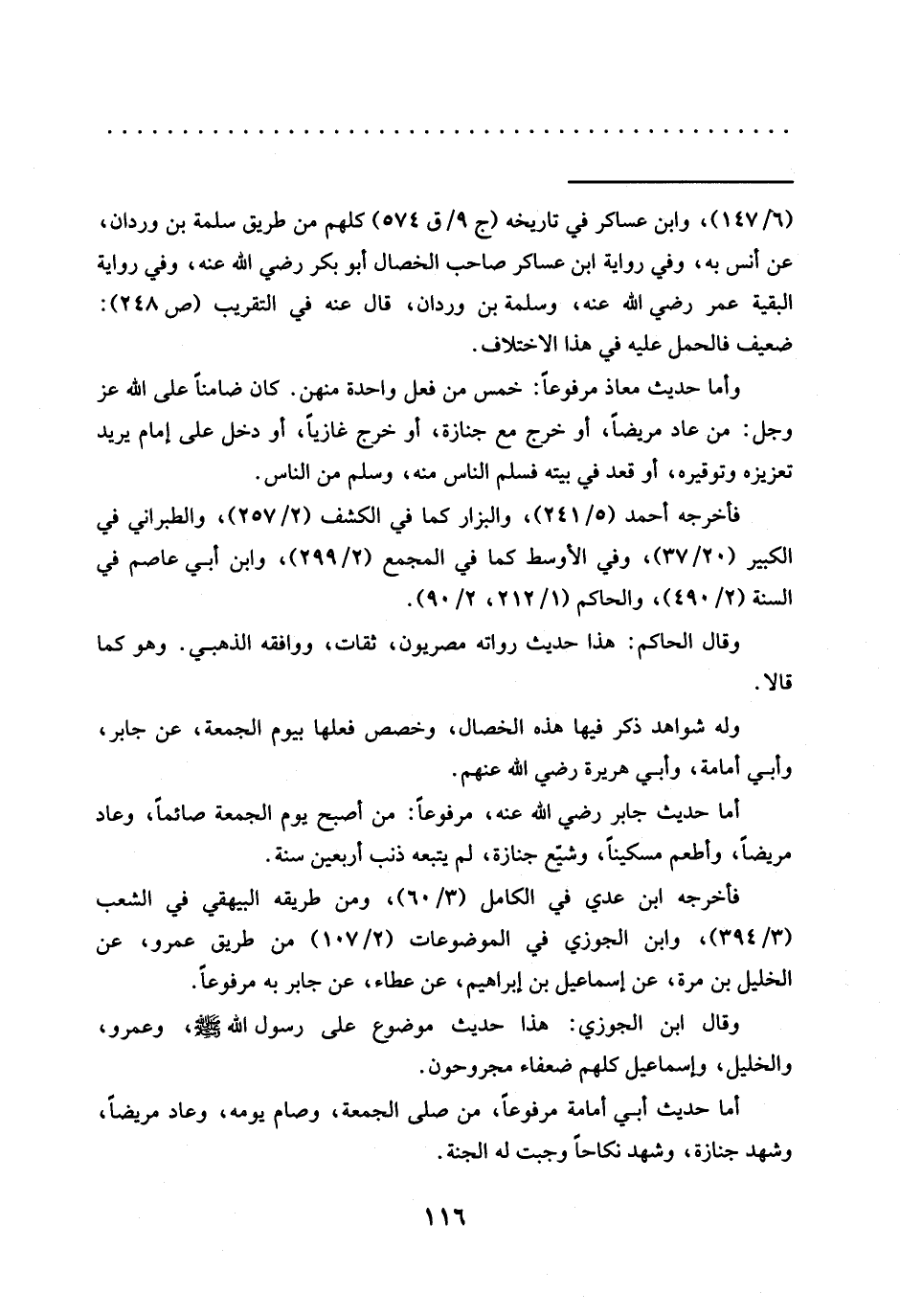 أما حديث أبي أمامة مرفوعًا، من صلى الجمعة، وصام يومه، وعاد مريضًا، وشهد جنازة، وشهد نكاحًا وجبت له الجنة. =