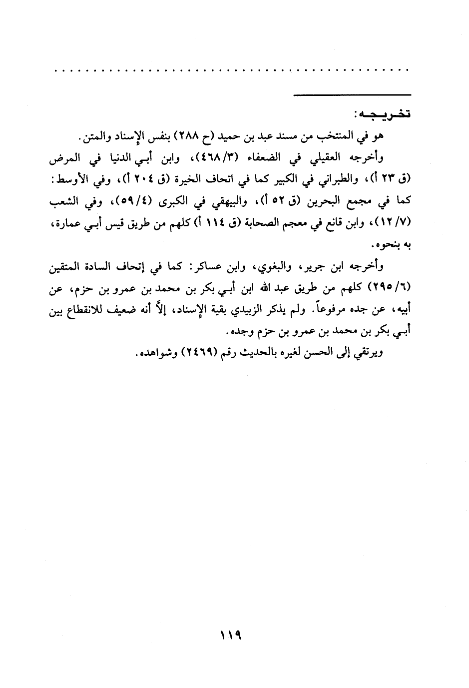 وأخرجه ابن جرير، والبغوي، وابن عساكر: كما في إتحاف السادة المتقين (6/ 295) كلهم من طريق عبد الله ابن أَبِي بَكْرِ بْنِ مُحَمَّدِ بْنِ عَمْرِو بْنِ حزم، عن أبيه، عن جده مرفوعًا. ولم يذكر الزبيدي بقية الإِسناد، إلَّا أنه ضعيف للانقطاع بين أَبِي بَكْرِ بْنِ مُحَمَّدِ بْنِ عَمْرِو بْنِ حزم وجده.