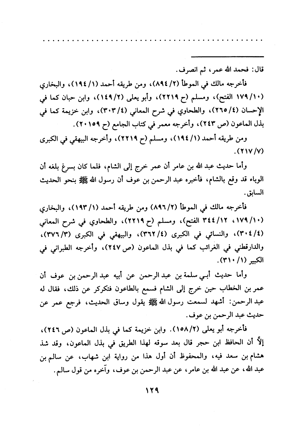 فأخرجه أبو يعلى (2/ 158). وابن خزيمة كما في بذل الماعون (ص 246)، إلَّا أن الحافظ ابن حجر قال بعد سوقه لهذا الطريق في بذل الماعون، وقد شذ هشام بن سعد فيه، والمحفوظ أن أول هذا من رواية ابن شهاب، عن سالم بْنُ عَبْدِ اللَّهِ، عَنْ عَبْدِ اللَّهِ بْنِ عامر، عن عبد الرحمن بن عوف، وآخره من قول سالم. =