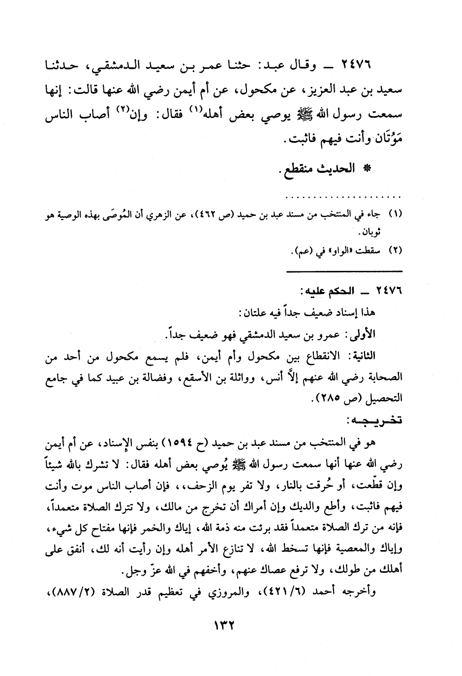 2476 - وَقَالَ عَبْدٌ: حَدَّثَنَا عُمَرُ بْنُ سَعِيدٍ الدِّمَشْقِيُّ، حَدَّثَنَا سَعِيدُ بْنُ عَبْدِ الْعَزِيزِ، عَنْ مَكْحُولٍ، عَنْ أُمِّ أَيْمَنَ رَضِيَ الله عَنْهَا قَالَتْ: إِنَّهَا سَمِعَتْ رَسُولَ اللَّهِ صَلَّى اللَّهُ عَلَيْهِ وَسَلَّمَ يُوصِي بَعْضَ أَهْلِهِ فَقَالَ: §وَإِنْ أَصَابَ النَّاسَ مُوْتَانٌ وَأَنْتَ فِيهِمْ فَاثْبُتْ.