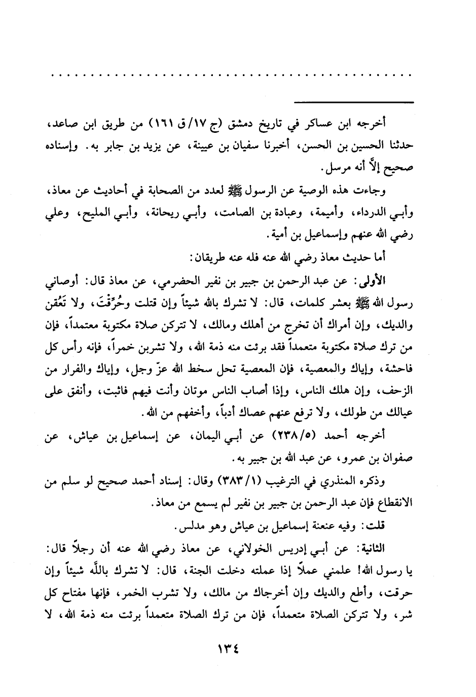 الأولى: عن عبد الرحمن بن جبير بن نفير الحضرمي، عن معاذ قال: أوصاني رسول الله -صلى الله عليه وسلم- بعشر كلمات، قال: لا تشرك باللهِ شيئًا وإن قتلت وحُرقْتَ، ولا تَعُقن والديك، وإن أمراك أن تخرج من أهلك ومالك، لا تتركن صلاة مكتوبة متعمدًا، فإن من ترك صلاة مكتوبة متعمدًا فقد برئت منه ذمة الله، ولا تشربن خمرًا، فإنه رأس كل فاحشة، وإياك والمعصية، فإن المعصية تحل سخط الله عزّ وجل، واياك والفرار من الزحف، وإن هلك الناس، وإذا أصاب الناس موتان وأنت فيهم فاثبت، وأنفق على عيالك من طولك، ولا ترفع عنهم عصاك أدبًا، وأخفهم من الله.