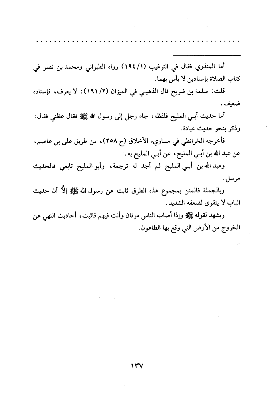 = أما المنذري فقال في الترغيب (1/ 194) رواه الطبراني ومحمد بن نصر في كتاب الصلاة بإسنادين لا بأس بهما.