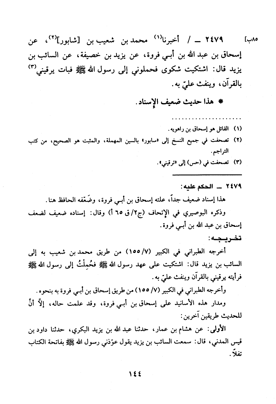2479 - / أَخْبَرَنَا مُحَمَّدُ بْنُ شُعَيْبِ بْنِ [شابُورَ] ، عَنْ إِسْحَاقَ بْنِ عَبْدِ اللَّهِ بْنِ أَبِي فَرْوَةَ، عَنْ يَزِيدَ بْنِ خُصَيْفَةَ، عَنِ السَّائِبِ بْنِ يَزِيدَ قَالَ: §اشْتَكَيْتُ شَكْوَى فَحَمَلُونِي إِلَى رَسُولِ اللَّهِ صَلَّى اللَّهُ عَلَيْهِ وَسَلَّمَ فَبَاتَ يَرْقِينِي بِالْقُرْآنِ، وَيَنْفُثُ عَلَيَّ بِهِ.