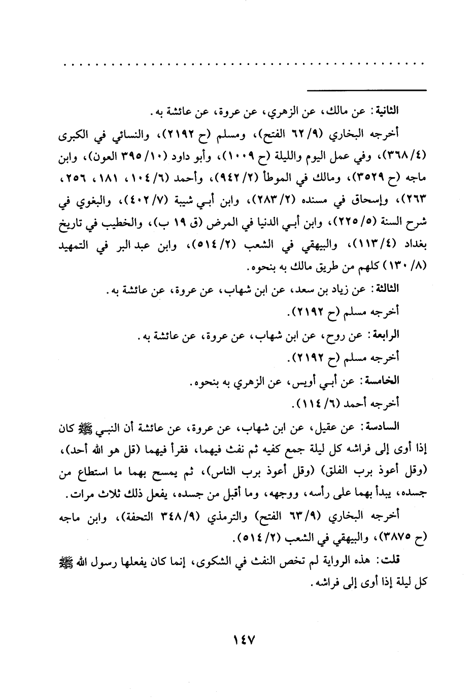 السادسة: عن عقيل، عن ابن شهاب، عن عروة، عَنْ عَائِشَةَ أَنَّ النَّبِيَّ -صَلَّى اللَّهُ عَلَيْهِ وسلم- كان إذا أوى إلى فراشه كل ليلة جمع كفيه ثم نفث فيهما، فقرأ فيهما (قل هو الله أحد)، {قُلْ أَعُوذُ بِرَبِّ الْفَلَقِ} {قُلْ أَعُوذُ بِرَبِّ النَّاسِ}، ثم يمسح بهما ما استطاع من جسده، يبدأ بهما على رأسه، ووجهه، وما أقبل من جسده، يفعل ذلك ثلاث مرات.