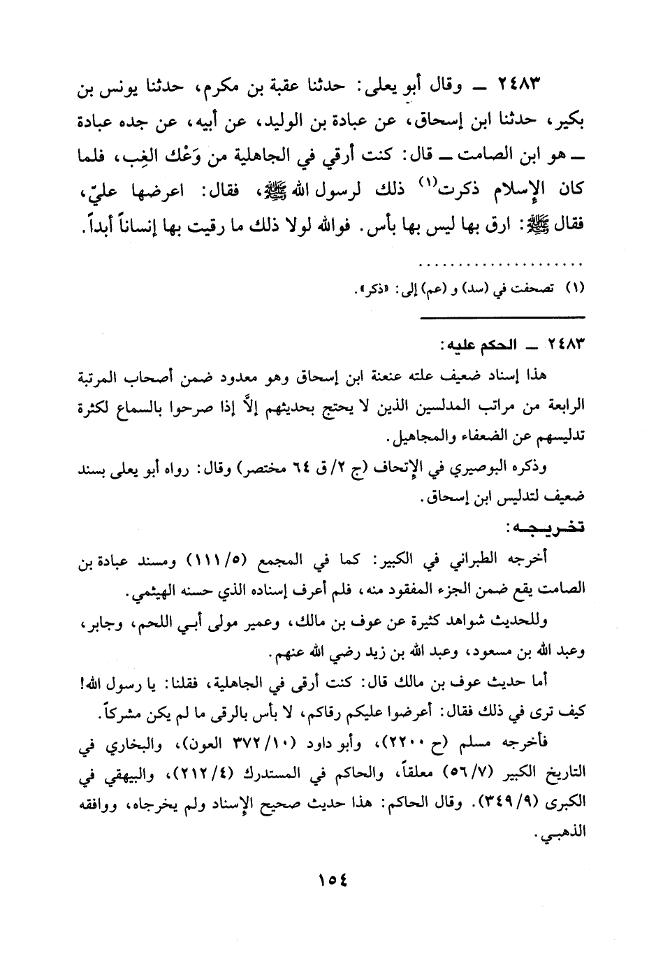 2483 - وَقَالَ أَبُو يَعْلَى: حَدَّثَنَا عُقْبَةُ بْنُ مُكْرَمٍ، حَدَّثَنَا يُونُسُ بْنُ بُكَيْرٍ، حَدَّثَنَا ابْنُ إِسْحَاقَ، عَنْ عُبَادَةَ بْنِ الْوَلِيدِ، عَنْ أَبِيهِ، عَنْ جَدِّهِ عُبَادَةَ - هُوَ ابْنُ الصَّامِتِ - قَالَ: كُنْتُ أَرْقِي فِي الْجَاهِلِيَّةِ مِنْ وُعَكِ الْغِبِّ، فَلَمَّا كَانَ الْإِسْلَامُ ذَكَرْتُ ذَلِكَ لِرَسُولِ اللَّهِ صَلَّى اللَّهُ عَلَيْهِ وَسَلَّمَ، فَقَالَ: اعْرِضْهَا عَلَيَّ، فَقَالَ صَلَّى اللَّهُ عَلَيْهِ وَسَلَّمَ: §ارْقَ بِهَا لَيْسَ بِهَا بَأْسٌ. فَوَاللَّهِ لَوْلَا ذَلِكَ مَا رَقَيْتُ بِهَا إِنْسَانًا أَبَدًا.