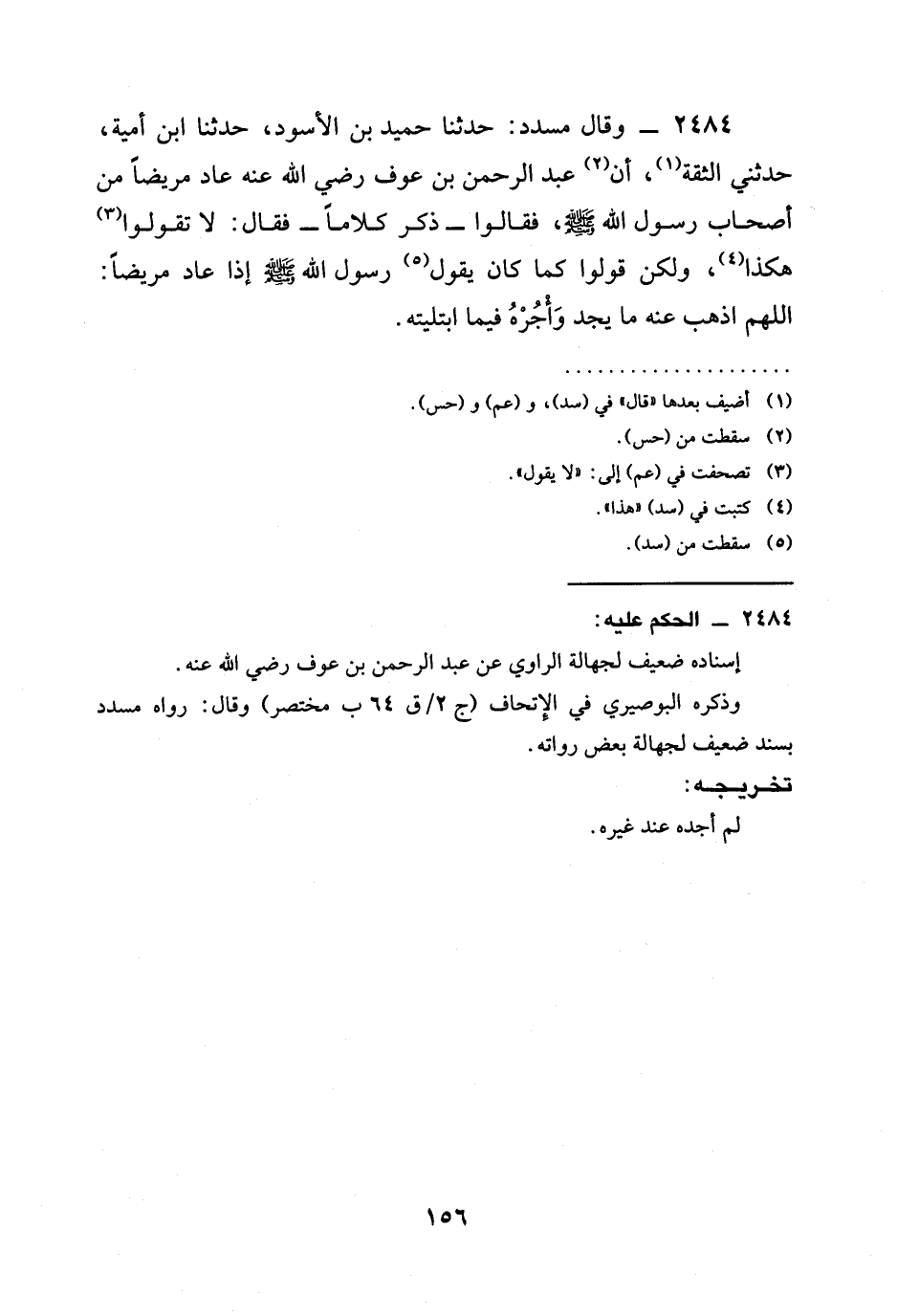 2484 - وَقَالَ مُسَدَّدٌ: حَدَّثَنَا حُمَيْدُ بْنُ الْأَسْوَدِ، حَدَّثَنَا ابْنُ أُمَيَّةَ، حَدَّثَنِي الثِّقَةُ، أَنَّ عَبْدَ الرَّحْمَنِ بْنَ عَوْفٍ رَضِيَ الله عَنْهُ عَادَ مَرِيضًا مِنْ أَصْحَابِ رَسُولِ اللَّهِ صَلَّى اللَّهُ عَلَيْهِ وَسَلَّمَ، فَقَالُوا - ذَكَرَ كَلَامًا - فَقَالَ: لَا تَقُولُوا هَكَذَا، وَلَكِنْ قُولُوا كَمَا كَانَ يَقُولُ رَسُولُ اللَّهِ صَلَّى اللَّهُ عَلَيْهِ وَسَلَّمَ إِذَا عَادَ مَرِيضًا: §اللَّهُمَّ أَذْهِبْ عَنْهُ مَا يَجِدُ وَآجِرْهُ فِيمَا ابْتَلَيْتَهُ.