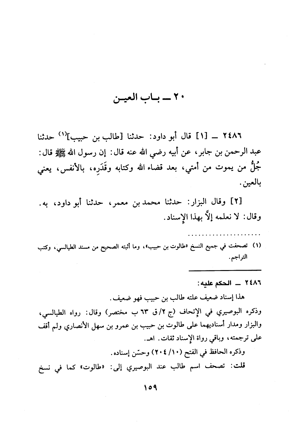 2486 -[1] قَالَ أَبُو دَاوُدَ: حَدَّثَنَا [طَالِبُ بْنُ حَبِيبٍ] حَدَّثَنَا عَبْدُ الرَّحْمَنِ بْنُ جَابِرٍ، عَنْ أَبِيهِ رَضِيَ الله عَنْهُ قَالَ: إِنَّ رَسُولَ اللَّهِ صَلَّى اللَّهُ عَلَيْهِ وَسَلَّمَ قَالَ: §جُلُّ مَنْ يَمُوتُ مِنْ أُمَّتِي، بَعْدَ قَضَاءِ اللَّهِ وَكِتَابِهِ وَقَدَرِهِ، بِالْأَنْفُسِ، يَعْنِي بالعين. [2] وَقَالَ الْبَزَّارُ: حَدَّثَنَا مُحَمَّدُ بْنُ مَعْمَرٍ، حَدَّثَنَا أَبُو دَاوُدَ، بِهِ. وَقَالَ: لَا نَعْلَمُهُ إِلَّا بِهَذَا الْإِسْنَادِ.