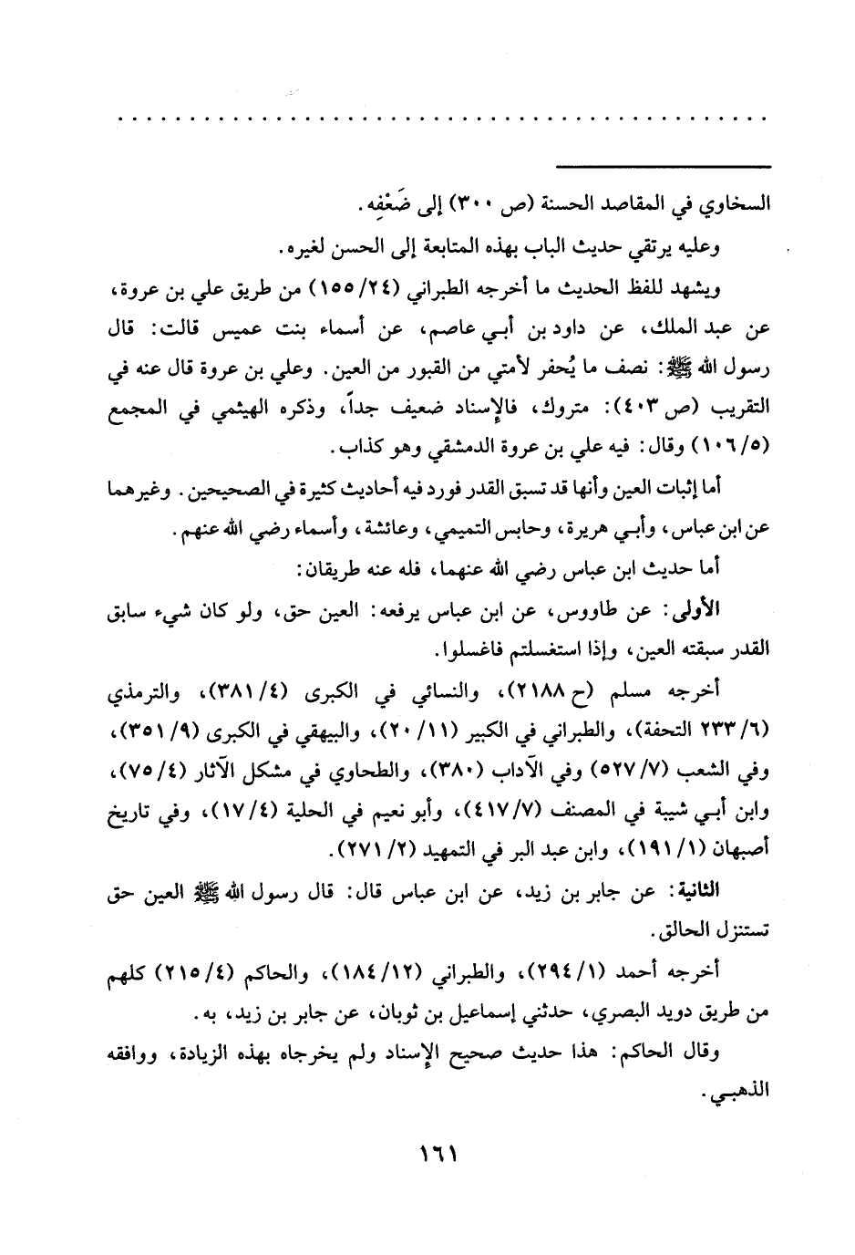 أما إثبات العين وأنها قد تسبق القدر فورد فيه أحاديث كثيرة في الصحيحين. وغيرهما عن ابن عباس، وأبي هريرة، وحابس التميمي، وعائشة، وأسماء رضي الله عنهم.