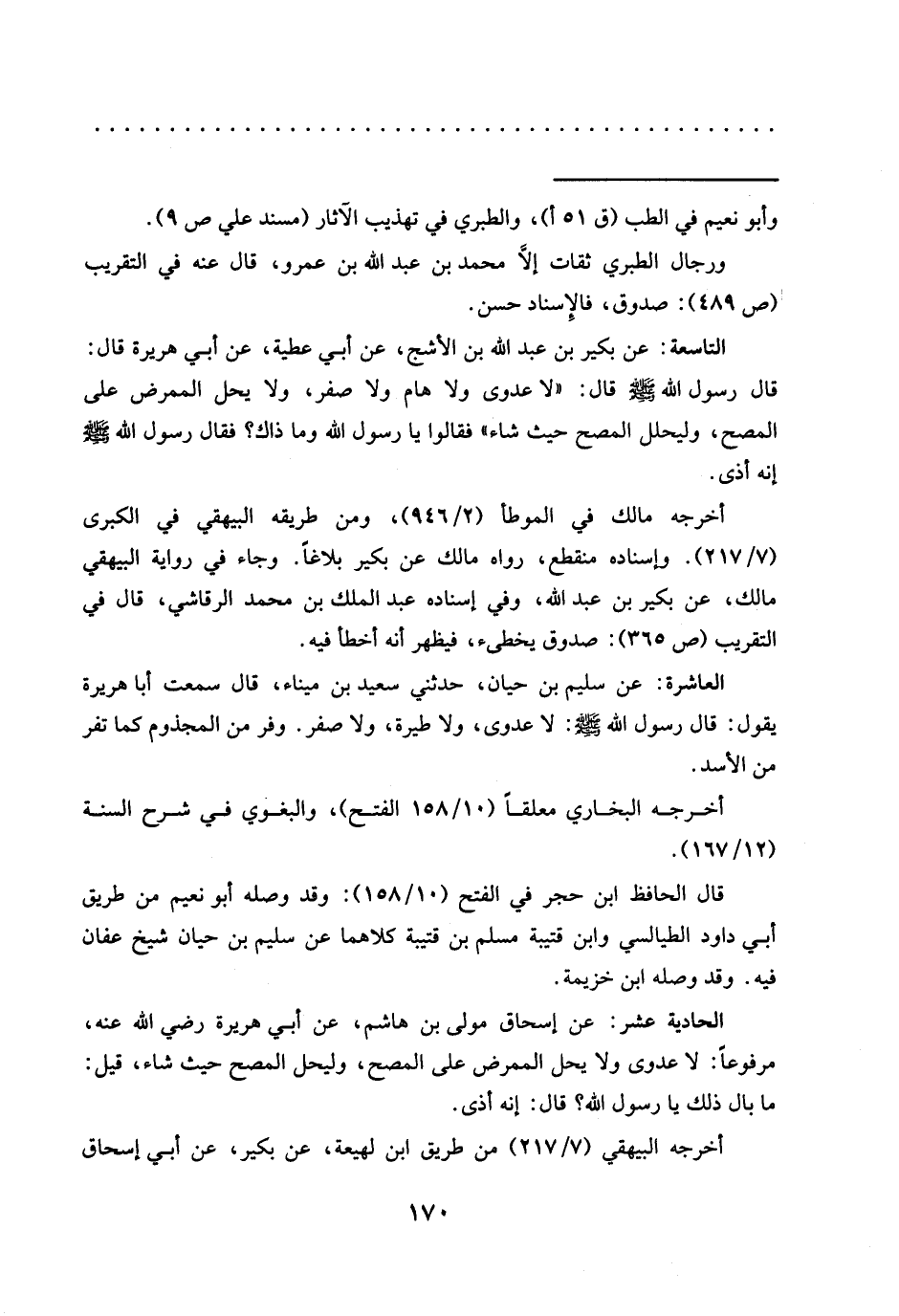 العاشرة: عن سليم بن حيان، حدثني سعيد بن ميناء، قَالَ سَمِعْتُ أَبَا هُرَيْرَةَ يَقُولُ؟ قَالَ رَسُولُ اللَّهِ -صَلَّى اللَّهُ عَلَيْهِ وَسَلَّمَ-: لَا عَدْوَى، وَلَا طِيَرَةَ، ولا صفر. وفر من المجذوم كما تفر من الأسد.