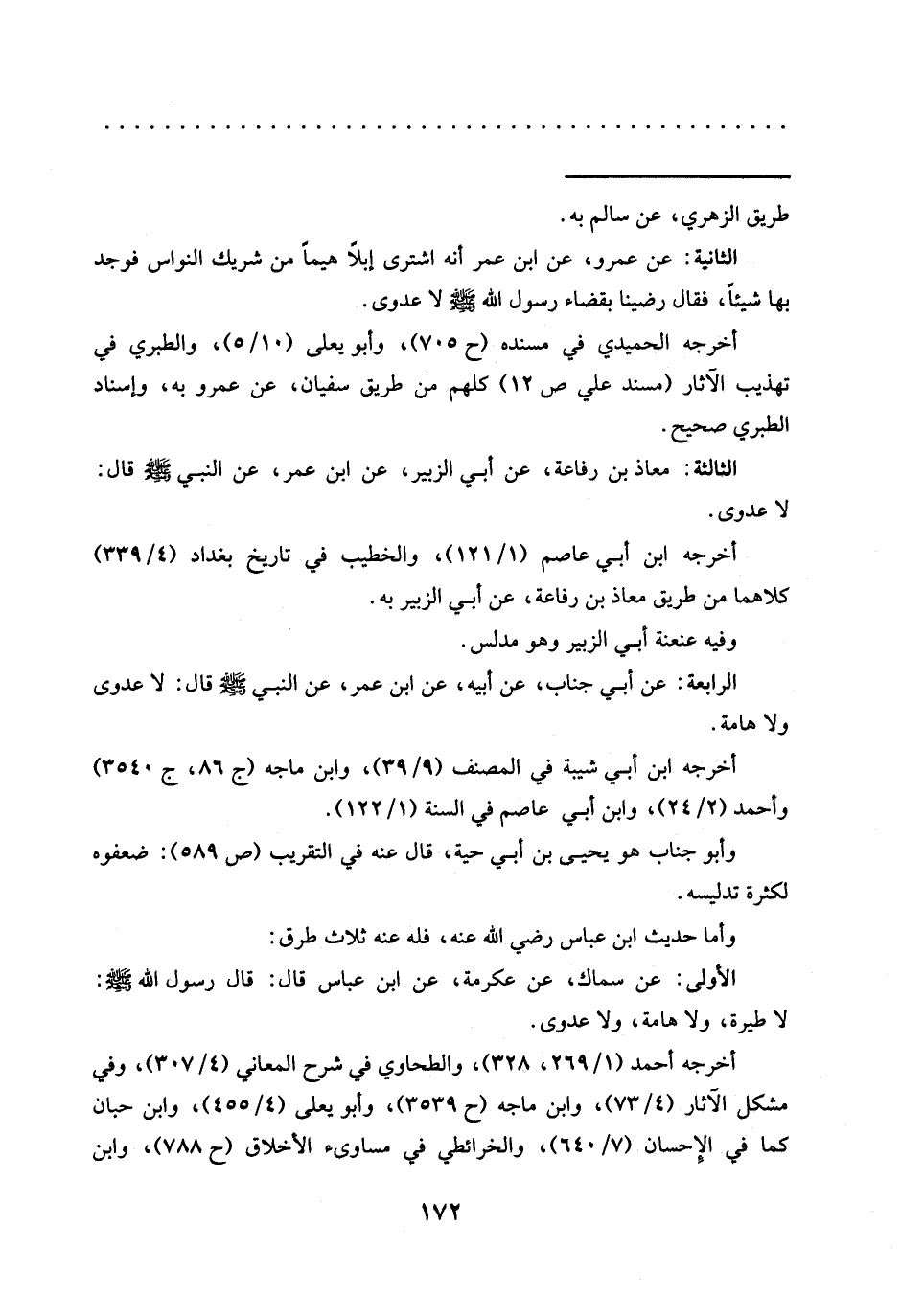 الثانية: عن عمرو، عن ابن عمر أنه اشترى إبلًا هيمًا من شريك النواس فوجد بها شيئًا، فقال رضينا بقضاء رَسُولُ اللَّهِ -صَلَّى اللَّهُ عَلَيْهِ وَسَلَّمَ- لَا عدوى.