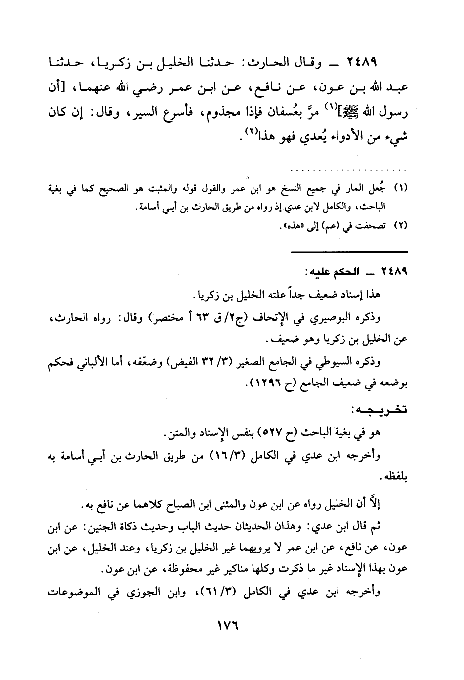 2489 - وَقَالَ الْحَارِثُ: حَدَّثَنَا الْخَلِيلُ بْنُ زَكَرِيَّا، حَدَّثَنَا عَبْدُ اللَّهِ بْنُ عَوْنٍ، عَنْ نَافِعٍ، عَنِ ابْنِ عُمَرَ رَضِيَ الله عَنْهُمَا، [أَنَّ رَسُولَ اللَّهِ صَلَّى اللَّهُ عَلَيْهِ وَسَلَّمَ] مَرَّ بِعُسْفَانَ فَإِذَا مَجْذُومٌ، فَأَسْرَعَ السَّيْرَ، وَقَالَ: §إِنْ كَانَ شَيْءٌ مِنَ الْأَدْوَاءِ يُعْدِي فَهُوَ هَذَا.
