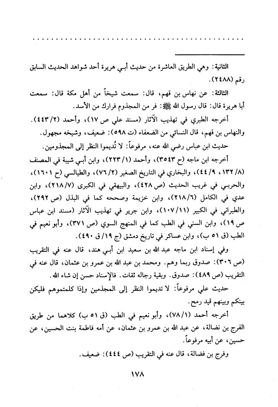 حديث علي مرفوعًا: لا تديموا النظر إلى المجذمين وإذا كلمتموهم فليكن بينكم وبينهم قيد رمح.