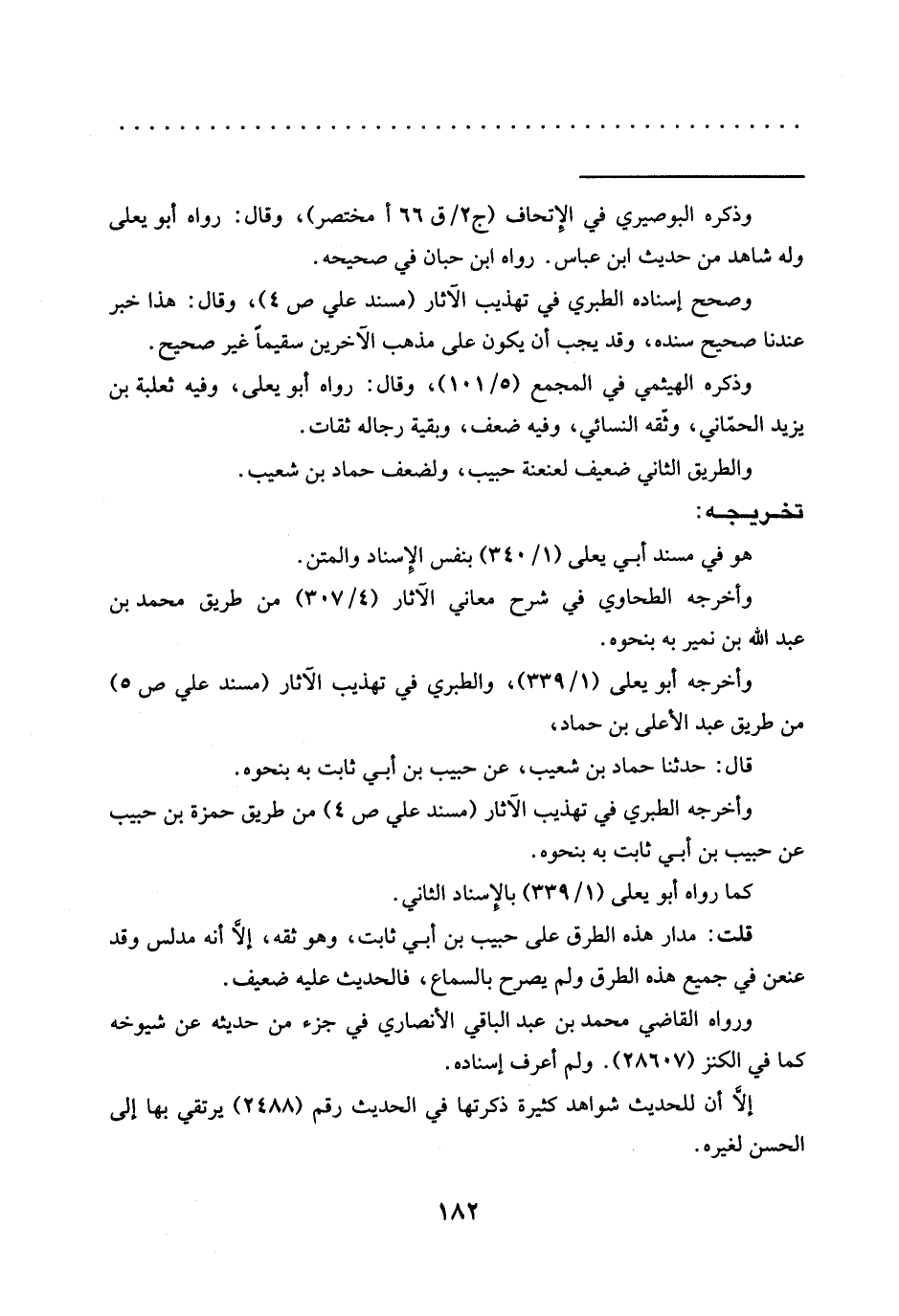 وأخرجه أبو يعلى (1/ 339)، والطبري في تهذيب الآثار (مسند علي ص 5) من طريق عبد الأعلي بن حماد، قال: حَدَّثَنَا حَمَّادُ بْنُ شُعَيْبٍ، عَنْ حَبِيبِ بْنِ أبي ثابت به بنحوه.