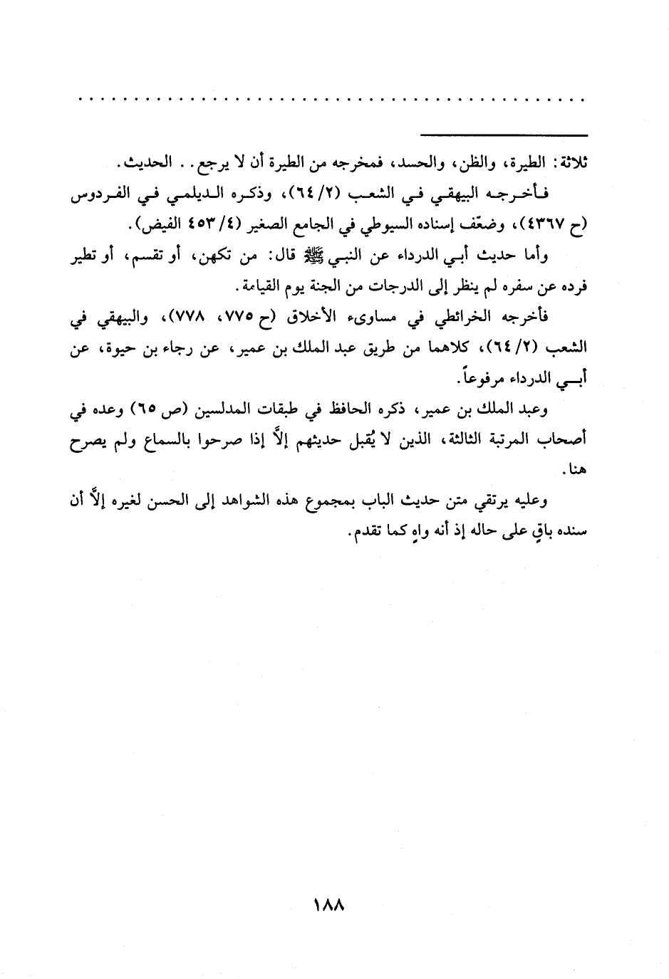 وأما حديث أَبِي الدَّرْدَاءِ عَنِ النَّبِيِّ -صَلَّى اللَّهُ عَلَيْهِ وسلم- قال: من تكهن، أو تقسم، أو تطير فرده عن سفره لم ينظر إلى الدرجات من الجنة يوم القيامة.
