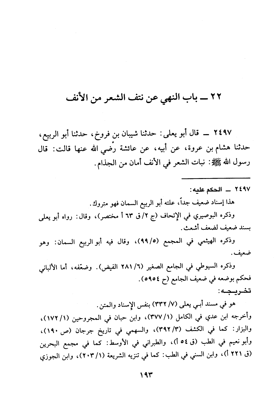 2497 - قَالَ أَبُو يَعْلَى: حَدَّثَنَا شَيْبَانُ بْنُ فَرُّوخَ، حَدَّثَنَا أَبُو الرَّبِيعِ، حَدَّثَنَا هِشَامُ بْنُ عُرْوَةَ، عَنْ أَبِيهِ، عَنْ عَائِشَةَ رَضِيَ الله عَنْهَا قَالَتْ: قَالَ رَسُولُ اللَّهِ صَلَّى اللَّهُ عَلَيْهِ وَسَلَّمَ: §نَبَاتُ الشَّعْرِ فِي الْأَنْفِ أَمَانٌ مِنَ الْجُذَامِ.