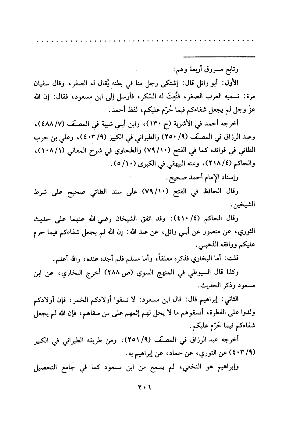 الأول: أبو وائل قال: إشتكى رجل منا في بطنه يقال له الصفر، وقال سفيان مرة: تسميه العرب الصغر، فنُعِتَ له السّكر، فأرسل إلى ابن مسعود، فقال: إِنَّ اللَّهَ عَزَّ وَجَلَّ لَمْ يَجْعَلْ شِفَاءَكُمْ فيما حُرّم عليكم، لفظ أحمد.