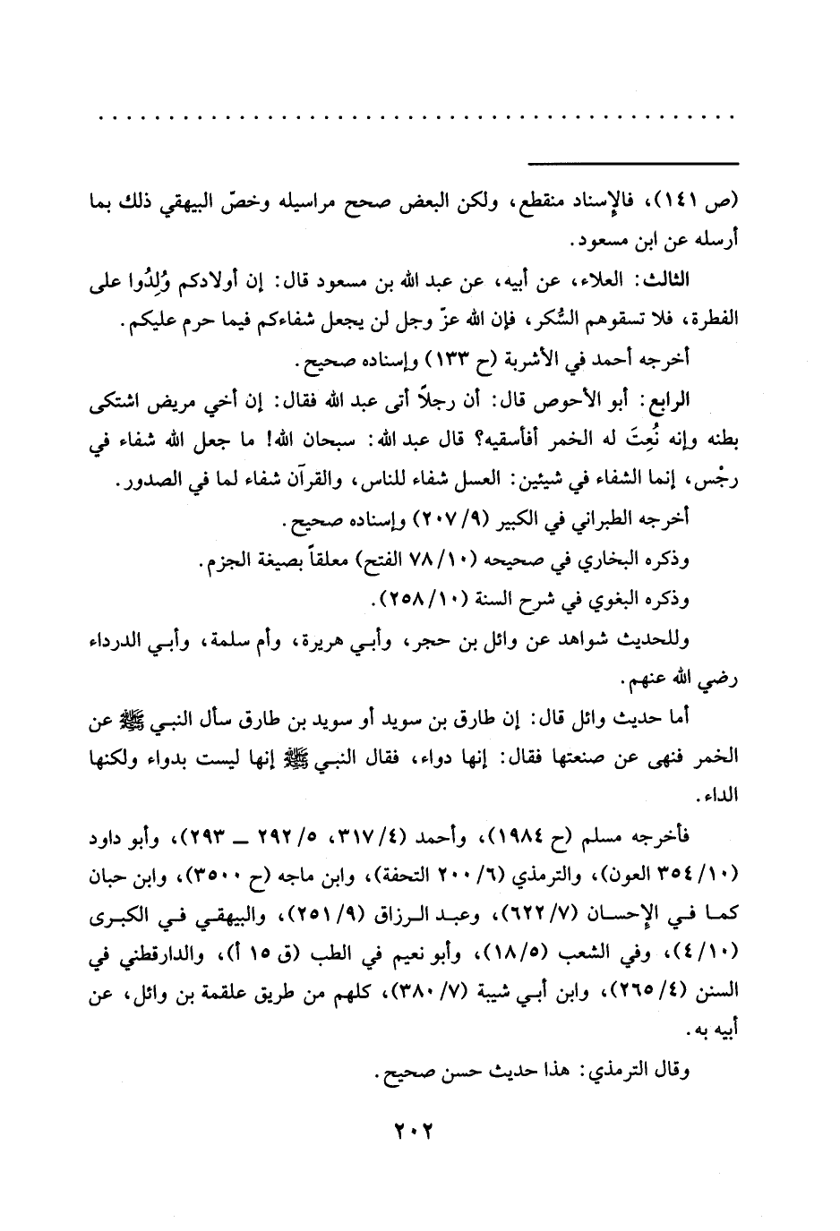الرابع: أبو الأحوص قال: أن رجلًا أتى عبد الله فقال: إن أخي مريض اشتكى بطنه وإنه نُعِتَ له الخمر أفأسقيه؟ قال عبد الله: سبحان الله! ما جعل الله شفاء في رجْس، إنما الشفاء في شيئين: العسل شفاء للناس، والقرآن شفاء لما في الصدور.