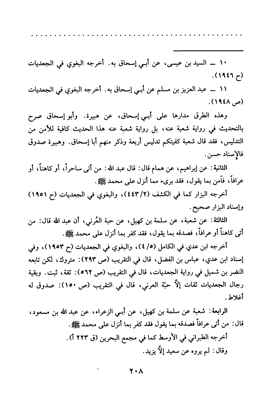 الثالثة: عَنْ شُعْبَةَ، عَنْ سَلَمَةَ بْنِ كُهَيْلٍ، عَنْ حبة العُرني، أن عبد الله قال: من أتى كاهنًا أو عرافًا، فصدقه مما يقول، فقد كفر مما أُنْزِلَ عَلَى مُحَمَّدٍ -صَلَّى اللَّهُ عَلَيْهِ وَسَلَّمَ-.