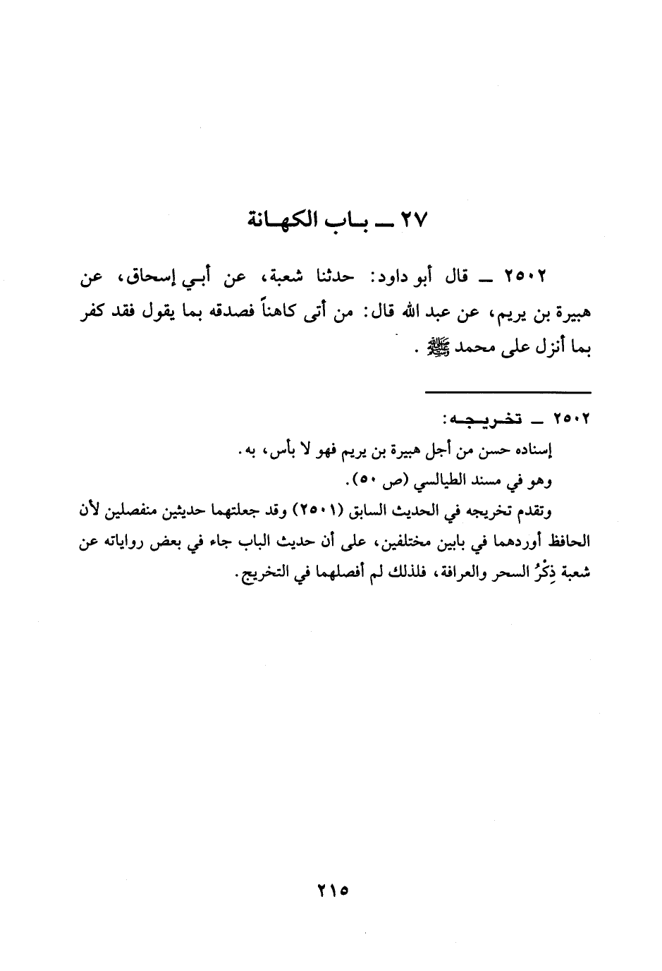2502 - قَالَ أَبُو دَاوُدَ: حَدَّثَنَا شُعْبَةُ، عَنْ أَبِي إِسْحَاقَ، عَنْ هُبَيْرَةَ بْنِ يَرِيمَ، عَنْ عَبْدِ اللَّهِ قَالَ: §مَنْ أَتَى كَاهِنًا فَصَدَّقَهُ بِمَا يَقُولُ فَقَدْ كَفَرَ بِمَا أُنْزِلَ عَلَى مُحَمَّدٍ صَلَّى اللَّهُ عَلَيْهِ وَسَلَّمَ.