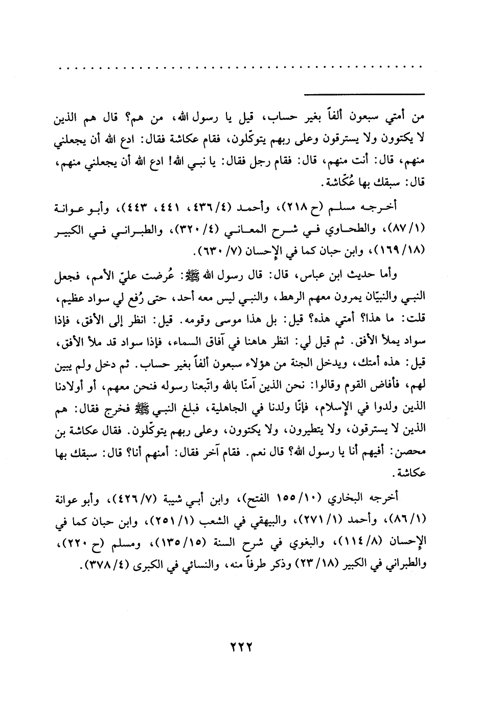 وأما حديث ابْنِ عَبَّاسٍ، قَالَ: قَالَ رَسُولُ اللَّهِ -صَلَّى الله عليه وسلم-: عُرضت عليّ الأمم، فجعل النبي والنبيّان يمرون معهم الرهط، والنبي ليس معه أحد، حتى رُفع لي سواد عظيم، قلت: ما هذا؟ أمتي هذه؟ قيل: بل هذا موسى وقومه. قيل: انظر إلى الأفق، فإذا سواد يملأ الأفق. ثم قيل لي: انظر ها هنا في آفاق السماء، فإذا سواد قد ملأ الأفق، قيل: هذه أمتك، ويدخل الجنة من هؤلاء سبعون ألفا بغير حساب. ثم دخل ولم يبين لهم، فافاض القوم وقالوا: نحن الذين آمنا بالله واتبعنا رسوله فنحن معهم، أو أولادنا الذين ولدوا في الإِسلام، فإنّا ولدنا في الجاهلية، فبلغ النبي -صلى الله عليه وسلم- فخرج فقال: هم الذين لا يسترقون، ولا يتطيرون، ولا يكتوون، وعلى ربهم يتوكلون. فقال عكاشة بن محصن: أفيهم أنا يا رسول الله؟ قال نعم. فقام آخر فقال: أمنهم أنا؟ قال: سبقك بها عكاشة.