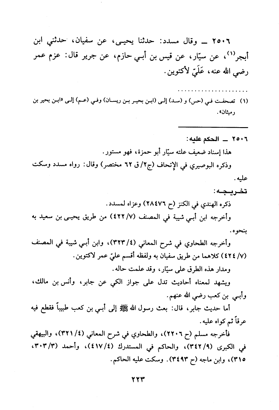 2506 - وَقَالَ مُسَدَّدٌ: حَدَّثَنَا يَحْيَى، عَنْ سُفْيَانَ، حَدَّثَنِي ابْنُ أَبْجَرَ، عَنْ سَيَّارٍ، عَنْ قَيْسِ بْنِ أَبِي حَازِمٍ، عَنْ جَرِيرٍ قَالَ: §عَزَمَ عُمَرُ رَضِيَ الله عَنْهُ، عَلَيَّ لَأَكْتَوِيَنَّ.