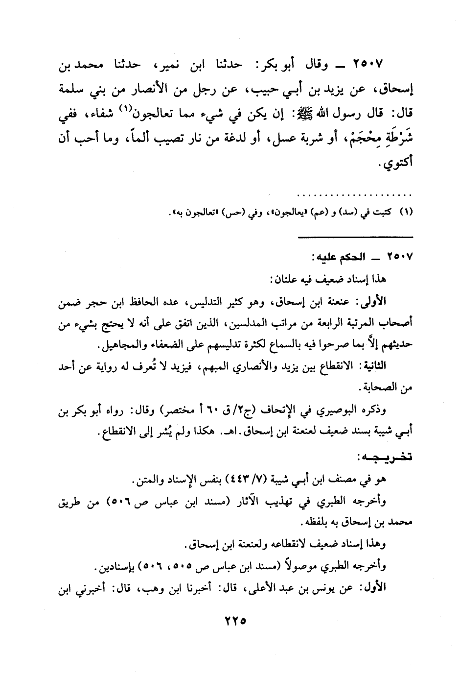 2507 - وَقَالَ أَبُو بَكْرٍ: حَدَّثَنَا ابْنُ نُمَيْرٍ، حَدَّثَنَا مُحَمَّدُ بْنُ إِسْحَاقَ، عَنْ يَزِيدَ بْنِ أَبِي حَبِيبٍ، عَنْ رَجُلٍ مِنَ الْأَنْصَارِ مِنْ بَنِي سَلَمَةَ قَالَ: قَالَ رَسُولُ اللَّهِ صَلَّى اللَّهُ عَلَيْهِ وَسَلَّمَ: §إِنْ يَكُنْ فِي شَيْءٍ مِمَّا تُعَالِجُونَ شِفَاءٌ، فَفِي شَرْطَةِ مِحْجَمٍ، أَوْ شَرْبَةِ عَسَلٍ، أَوْ لَدْغَةٍ مِنْ نَارٍ تُصِيبُ أَلَمًا، وَمَا أُحِبُّ أَنْ أَكْتَوِيَ.