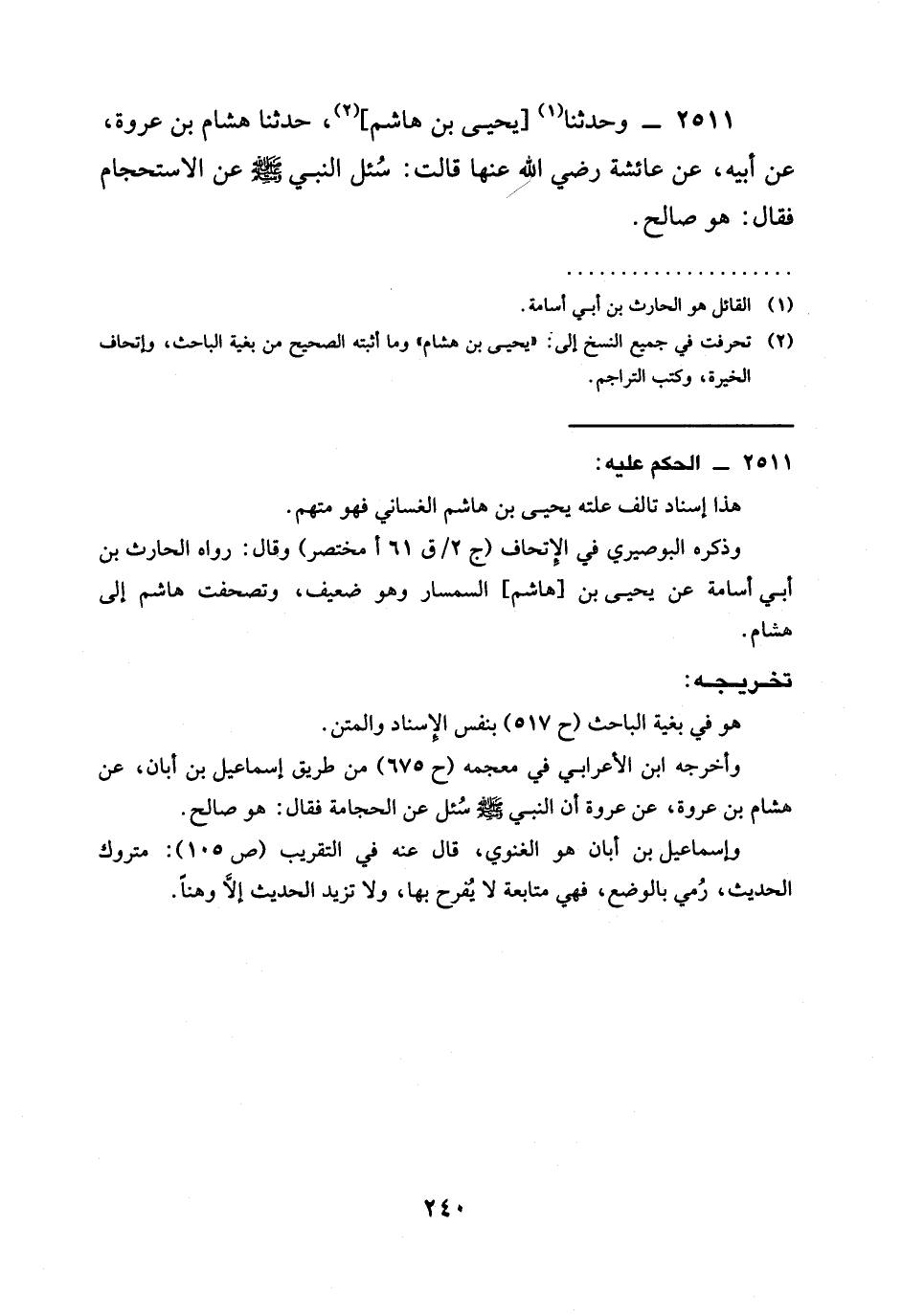2511 - وَحَدَّثَنَا [يَحْيَى بْنُ هَاشِمٍ] ، حَدَّثَنَا هِشَامِ بْنِ عُرْوَةَ، عَنْ أَبِيهِ، عَنْ عَائِشَةَ رَضِيَ الله عَنْهَا قَالَتْ: §سُئِلَ النَّبِيُّ صَلَّى اللَّهُ عَلَيْهِ وَسَلَّمَ عَنِ الِاسْتِحْجَامِ فَقَالَ هُوَ صَالِحٌ.