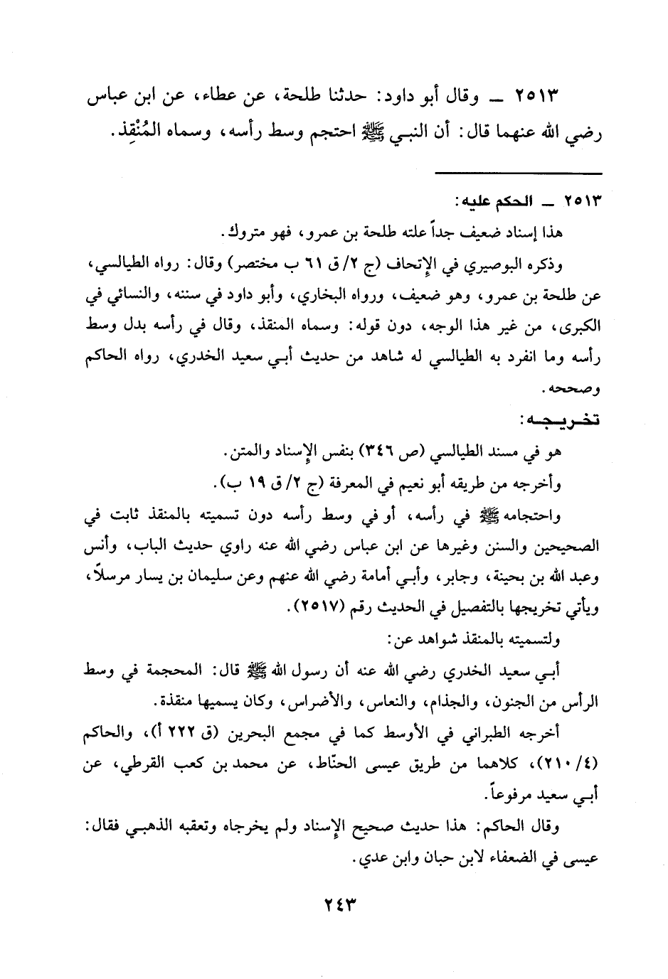 2513 - وَقَالَ أَبُو دَاوُدَ: حَدَّثَنَا طَلْحَةُ، عَنْ عَطَاءٍ، عَنِ ابْنِ عَبَّاسٍ رَضِيَ الله عَنْهُمَا قَالَ: أَنَّ النَّبِيَّ صَلَّى اللَّهُ عَلَيْهِ وَسَلَّمَ §احْتَجَمَ وَسَطَ رَأْسِهِ، وَسَمَّاهُ الْمُنْقِذَ.