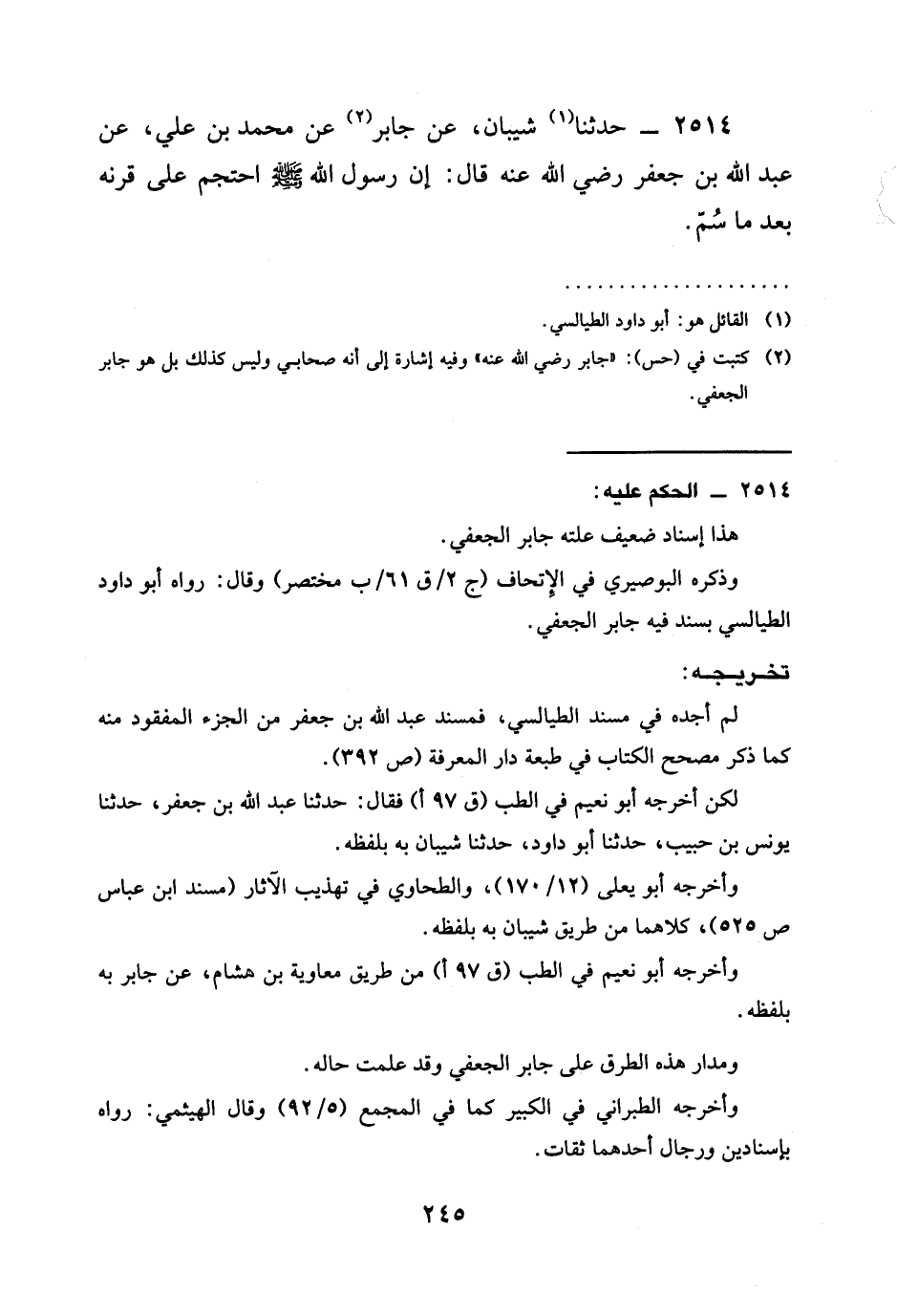 2514 - حَدَّثَنَا شَيْبَانُ، عَنْ جَابِرٍ عَنْ مُحَمَّدِ بْنِ عَلِيٍّ، عَنْ عَبْدِ اللَّهِ بْنِ جَعْفَرٍ رَضِيَ الله عَنْهُ قَالَ: إنَّ رَسُولَ اللَّهِ صَلَّى اللَّهُ عَلَيْهِ وَسَلَّمَ §احْتَجَمَ عَلَى قَرْنِهِ بَعْدَ مَا سُمَّ.