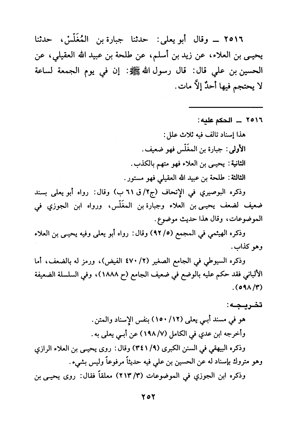 2516 - وَقَالَ أَبُو يَعْلَى: حَدَّثَنَا جُبَارَةُ بْنُ الْمُغَلِّسِ، حَدَّثَنَا يَحْيَى بْنُ الْعَلَاءِ، عَنْ زَيْدِ بْنِ أَسْلَمَ، عَنْ طَلْحَةَ بْنِ عُبَيْدِ اللَّهِ الْعُقَيْلِيِّ، عَنِ الْحُسَيْنِ بْنِ عَلِيٍّ قَالَ: قَالَ رَسُولُ اللَّهِ صَلَّى اللَّهُ عَلَيْهِ وَسَلَّمَ: إِنَّ §فِي يَوْمِ الْجُمُعَةِ لَسَاعَةٌ لَا يَحْتَجِمُ فِيهَا أَحَدٌ إِلَّا مَاتَ.