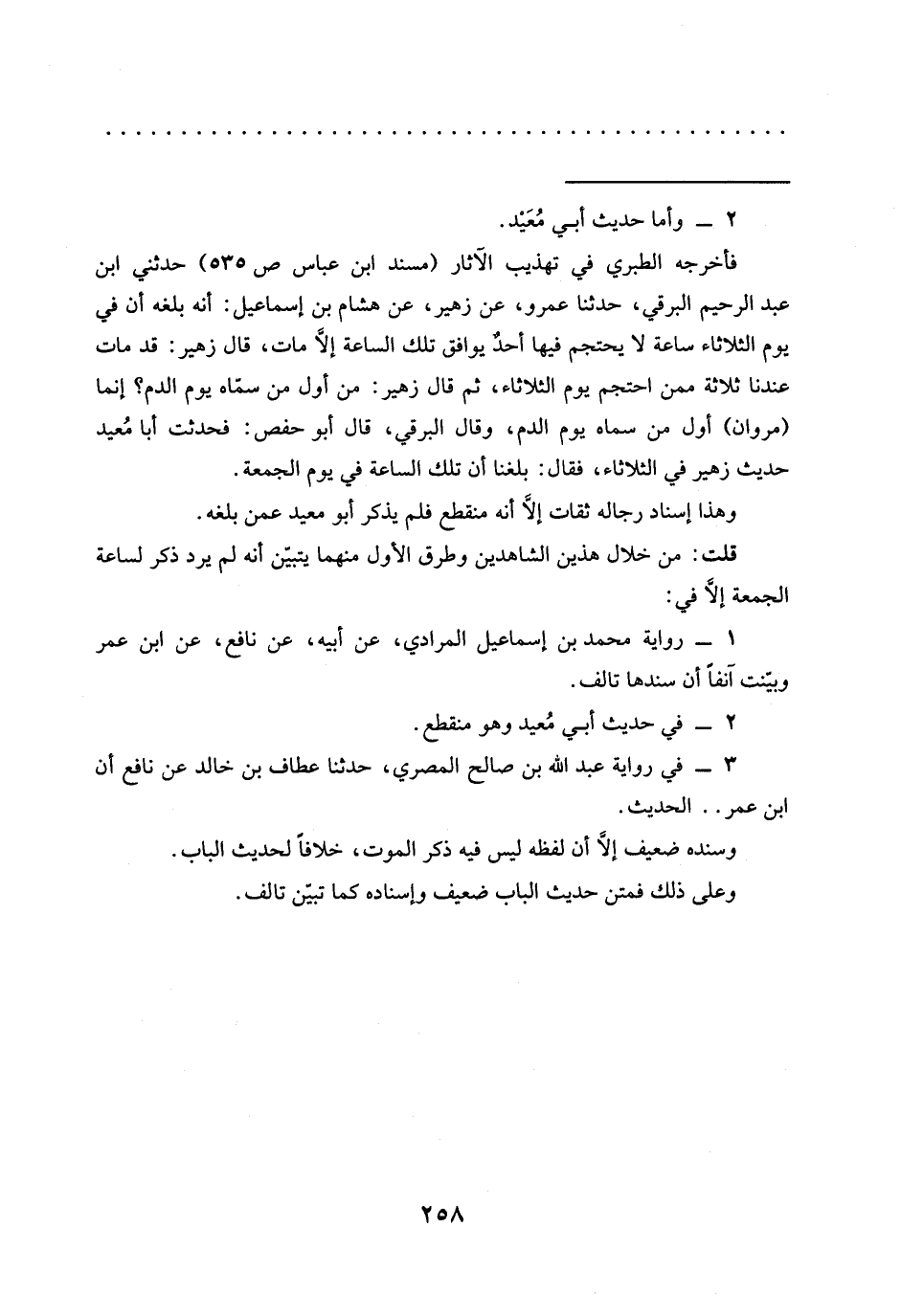 فأخرجه الطبري في تهذيب الآثار (مسند ابن عباس ص 535) حدثني ابن عبد الرحيم البرقي، حدّثنا عمرو، عن زهير، عن هشام بن إسماعيل: أنه بلغه أن في يوم الثلاثاء ساعة لا يحتجم فيها أحدُ يوافق تلك الساعة إلَّا مات، قال زهير: قد مات عندنا ثلاثة ممن احتجم يوم الثلاثاء، ثم قال زهير: من أول من سقاه يوم الدم؟ إنما (مروان) أول من سماه يوم الدم، وقال البرقي، قال أبو حفص: فحدثت أبا مُعيد حديث زهير في الثلاثاء، فقال: بلغنا أن تلك الساعة في يوم الجمعة.