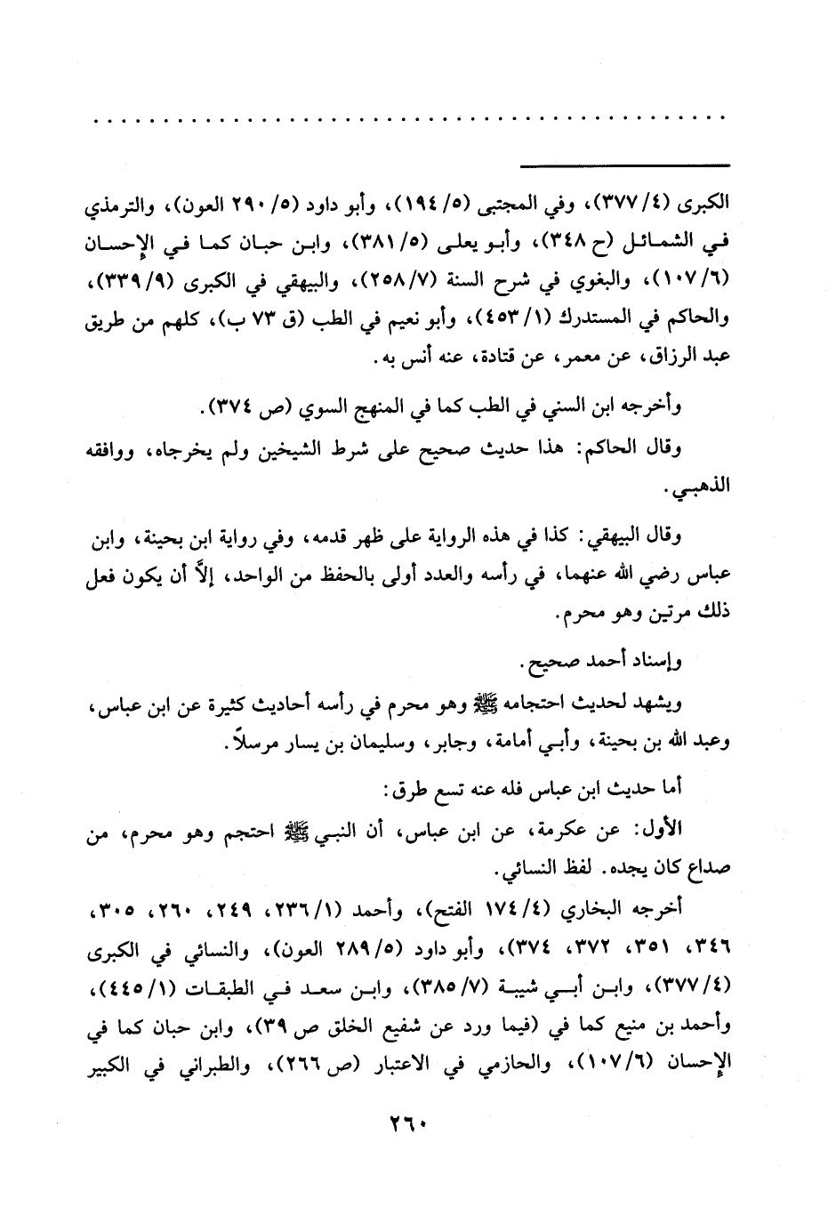 ويشهد لحديث احتجامه -صلى الله عليه وسلم- وهو محرم في رأسه أحاديث كثيرة عن ابن عباس، وعبد الله بن بحينة، وأبي أمامة، وجابر، وسليمان بن يسار مرسلًا.