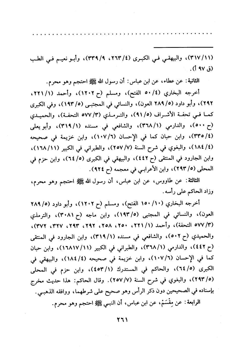 الثالثة: عن طاووس، عَنِ ابْنِ عَبَّاسٍ، أَنَّ رَسُولَ اللَّهِ -صَلَّى اللَّهُ عليه وسلم- احتجم وهو محرم، وزاد الحاكم على رأسه.