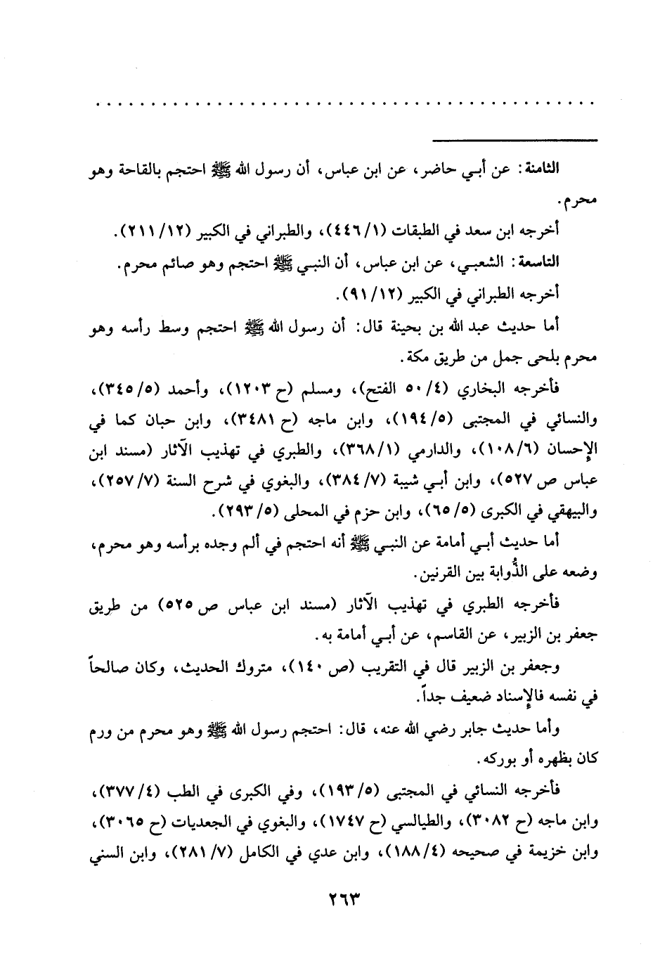 = الثامنة: عن أبي حاضر، عَنِ ابْنِ عَبَّاسٍ، أَنَّ رَسُولَ اللَّهِ -صَلَّى اللَّهُ عليه وسلم- احتجم بالقاحة وهو محرم.