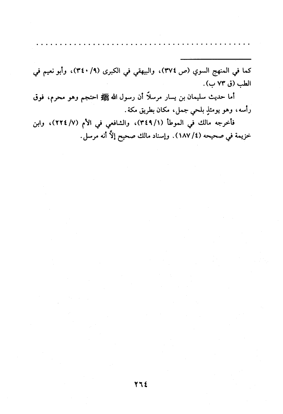 أما حديث سليمان بن يسار مرسلًا أن رسول الله -صلى الله عليه وسلم- احتجم وهو محرم، فوق رأسه، وهو يومئذِ بلحي جمل، مكان بطريق مكة.