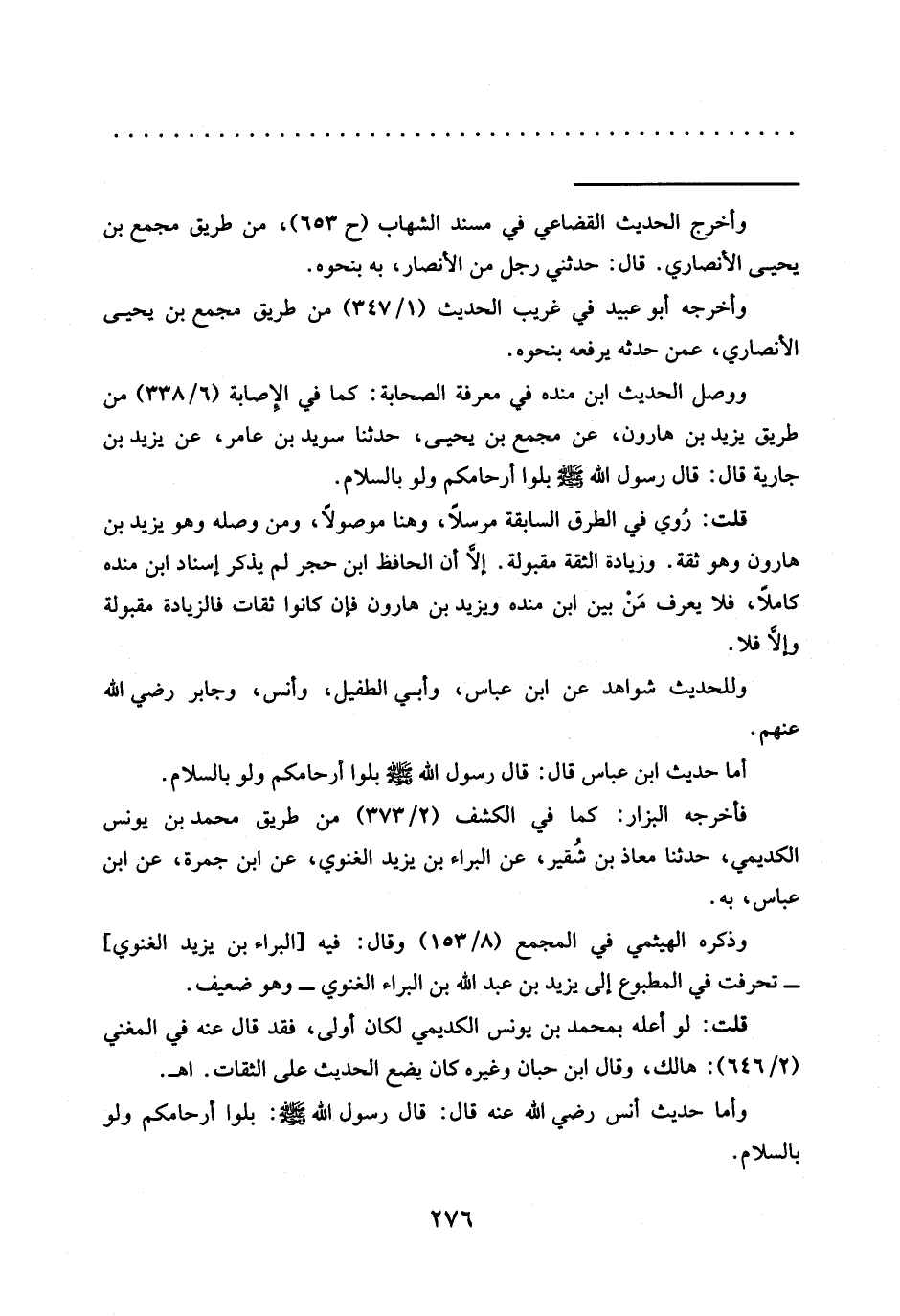 وأما حديث أَنَسٍ رَضِيَ اللَّهُ عَنْهُ قَالَ: قَالَ رَسُولُ اللَّهِ -صَلَّى اللَّهُ عَلَيْهِ وَسَلَّمَ-: بُلُّوا أَرْحَامَكُمْ ولو بالسلام. =