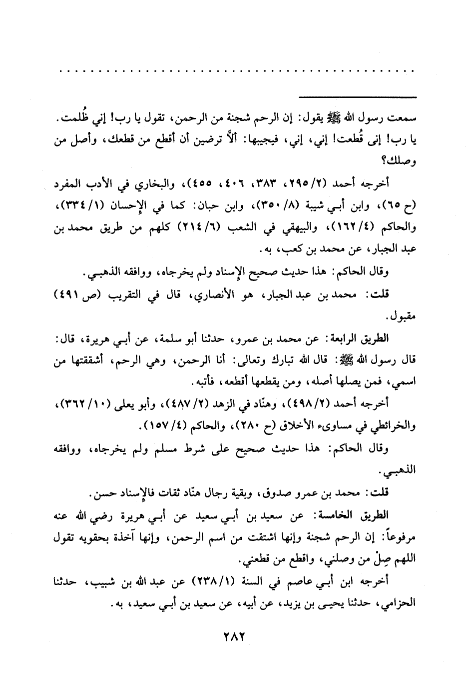 الطريق الخامسة: عَنْ سَعِيدِ بْنِ أَبِي سَعِيدٍ عَنْ أَبِي هريرة رضي الله عنه مرفوعًا: إن الرحم شجنة وإنها اشتقت من اسم الرحمن، وإنها آخذة بحقويه تقول اللهم صِلْ من وصلني، واقطع من قطعني.