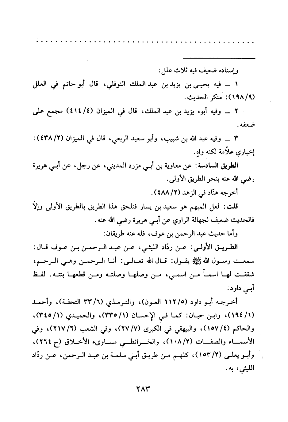 سمعت رسول الله -صلى الله عليه وسلم- يقول: قال الله تعالى: أنا الرحمن وهي الرحم، شققت لها اسمًا من اسمي، من وصلها وصلته ومن قطعها بتته. لفظ أبي داود.