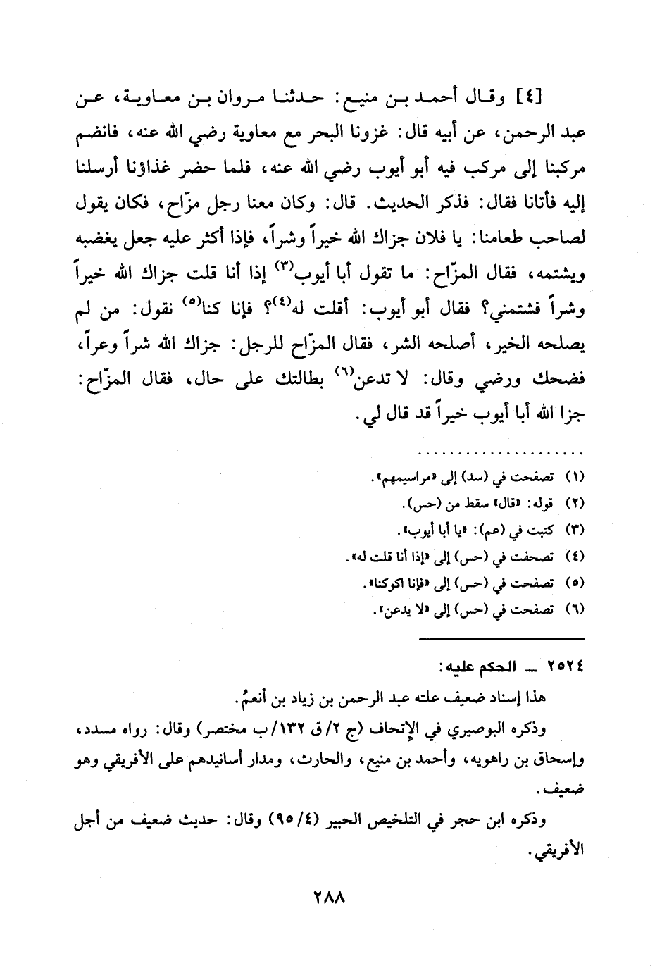 [4] وَقَالَ أَحْمَدُ بْنُ مَنِيعٍ: حَدَّثَنَا مَرْوَانُ بْنُ مُعَاوِيَةَ، عَنْ عَبْدِ الرَّحْمَنِ، عَنْ أَبِيهِ قَالَ: غَزَوْنَا الْبَحْرَ مع مُعَاوِيَةَ رَضِيَ الله عَنْه، فَانْضَمَّ مَرْكَبُنَا إِلَى مَرْكَبٍ فِيهِ أَبُو أَيُّوبَ رَضِيَ الله عَنْه، فَلَمَّا حَضَرَ غَذاؤُنَا أَرْسَلْنَا إِلَيْهِ فَأَتَانَا فَقَالَ: فَذَكَرَ الْحَدِيثَ. قَالَ: وَكَانَ مَعَنَا رَجُلٌ مَزَّاحٌ، فكَانَ يَقُولُ لِصَاحِبِ طَعَامِنَا: يَا فُلَانُ جَزَاكَ اللَّهُ خَيْرًا وشرًّا، فَإِذَا أَكْثَرَ عَلَيْهِ جَعَلَ يَغْضَبُه وَيَشْتُمَهُ، فَقَالَ: الْمَزَّاحُ: مَا تَقُولُ أَبَا أَيُّوبَ إِذَا أَنَا قُلْتُ جَزَاكَ اللَّهُ خَيْرًا وَشرًّا فَشَتَمَنِي؟ فَقَالَ أَبُو أَيُّوبَ: أقْلِتْ لَهُ؟ فَإِنَّا كُنَّا نَقُولُ: §مَنْ لَمْ يُصْلِحْهُ الْخَيْرُ، أَصْلَحَهُ الشَّرُّ، فَقَالَ الْمَزَّاحُ لِلرَّجُلِ: جَزَاكَ اللَّهُ شَرًّا وَعَرًّا، فَضَحِكَ وَرَضِيَ وَقَالَ: لَا تَدَعَنَّ بَطَالَتَكَ عَلَى حَالٍ، فَقَالَ الْمَزَّاحُ: جَزَا اللَّهُ أَبَا أَيُّوبَ خَيْرًا قَدْ قَالَ لِي.