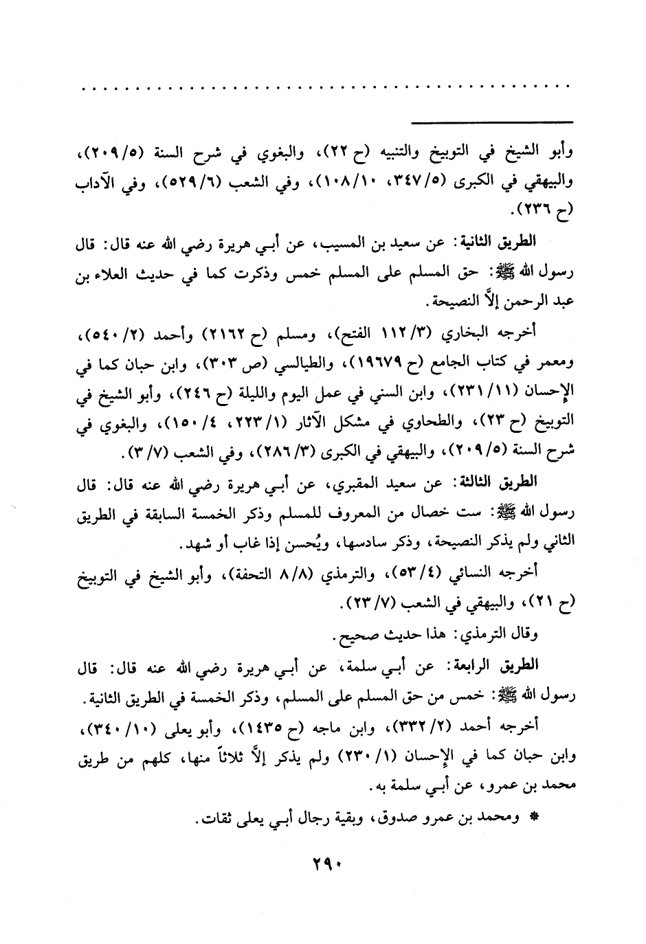 الطريق الرابعة: عَنْ أَبِي سَلَمَةَ، عَنْ أَبِي هُرَيْرَةَ رَضِيَ اللَّهُ عَنْهُ قَالَ: قَالَ رَسُولُ اللَّهِ -صلى الله عليه وسلم-: خمس من حق المسلم على المسلم، وذكر الخمسة في الطريق الثانية.