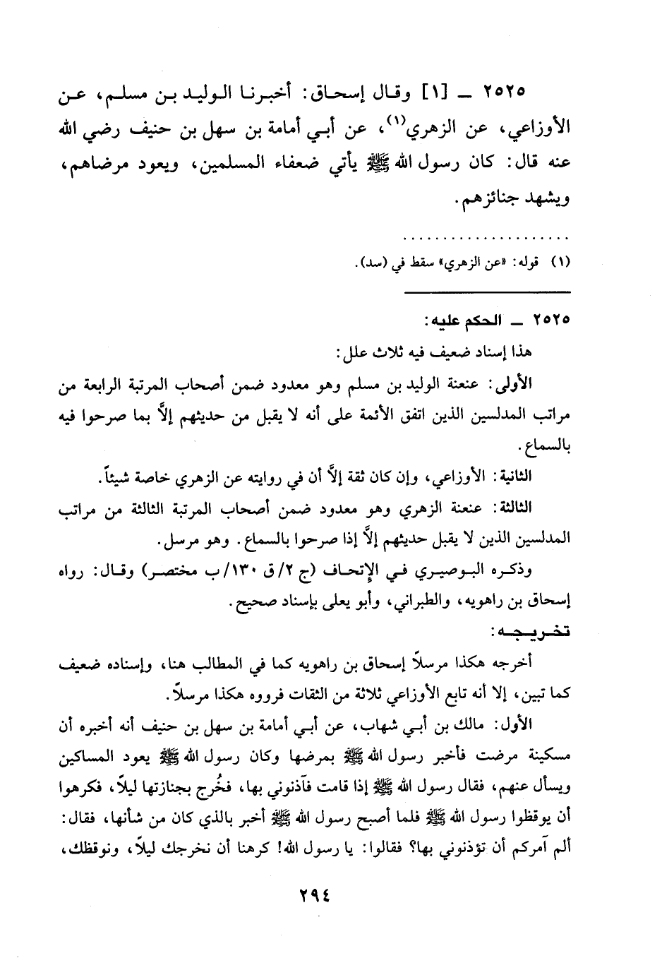 2525 -[1] وَقَالَ إِسْحَاقُ: أَخْبَرَنَا الْوَلِيدُ بْنُ مُسْلِمٍ، عَنِ الْأَوْزَاعِيِّ، عَنِ الزُّهْرِيِّ، عَنْ أَبِي أُمَامَةَ بْنِ سَهْلِ بْنِ حُنَيْفٍ رَضِيَ الله عَنْهُ قَالَ: كَانَ رَسُولُ اللَّهِ صَلَّى اللَّهُ عَلَيْهِ وَسَلَّمَ §يَأْتِي ضُعَفَاءَ الْمُسْلِمِينَ، وَيَعُودُ مَرْضَاهُمْ، وَيَشْهَدُ جَنَائِزَهُمْ -[299]-.