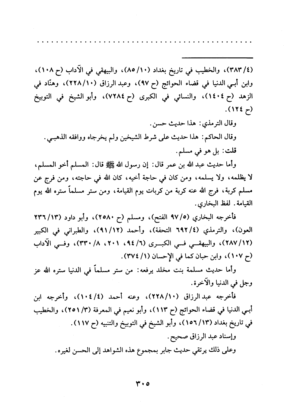 = (4/ 383)، والخطيب في تاريخ بغداد (10/ 85)، والبيهقي في الآداب (ح 108)، وابن أبي الدنيا في قضاء الحوائج (ح 97)، وعبد الرزاق (10/ 228)، وهنّاد في الزهد (ح 1404)، والنسائي في الكبرى (ح 7284)، وأبو الشيخ في التوبيخ (ح 124).