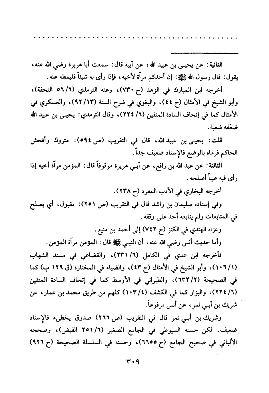 = الثانية: عَنْ يَحْيَى بْنِ عُبَيْدِ اللَّهِ، عَنْ أَبِيهِ قَالَ: سَمِعْتُ أَبَا هُرَيْرَةَ رَضِيَ اللَّهُ عَنْهُ، يَقُولُ: قَالَ رَسُولُ اللَّهِ -صَلَّى اللَّهُ عَلَيْهِ وسلم-: إن أحدكم مرآة لأخيه، فإذا رأى به شيئًا فليمطه عنه.