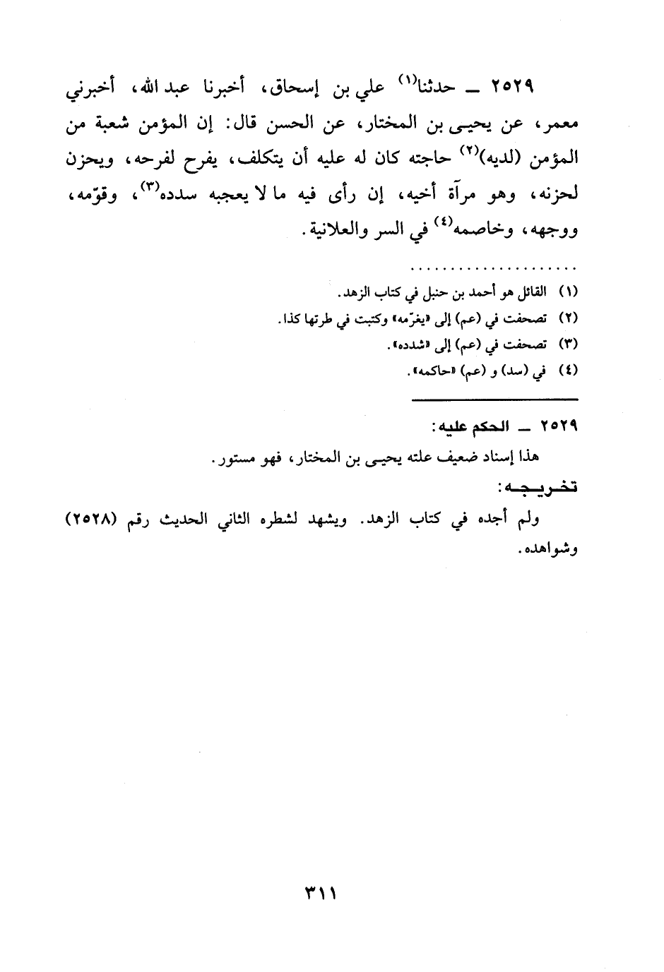 2529 - حَدَّثَنَا عَلِيُّ بْنُ إِسْحَاقَ، أَخْبَرَنَا عَبْدُ اللَّهِ، أَخْبَرَنِي مَعْمَرٌ، عَنْ يَحْيَى بْنِ الْمُخْتَارِ، عَنِ الْحَسَنِ قَالَ: إِنَّ §الْمُؤْمِنَ شُعْبَةٌ مِنَ الْمُؤْمِنِ (لَدَيْهِ) حَاجَتُهُ كَانَ لَهُ عَلَيْهِ أَنْ يَتَكَلَّفَ، يفرح لِفَرَحِهِ، وَيَحْزَنَ لِحُزْنِهِ، وَهُوَ مِرَْآةُ أَخِيهِ، إِنْ رَأَى فِيهِ مَا لَا يُعْجِبُهُ سَدَّدَهُ، وَقَوَّمَهُ، وَوَجَّهَهُ، وَخَاصَمَهُ فِي السِّرِّ وَالْعَلَانِيَةِ.