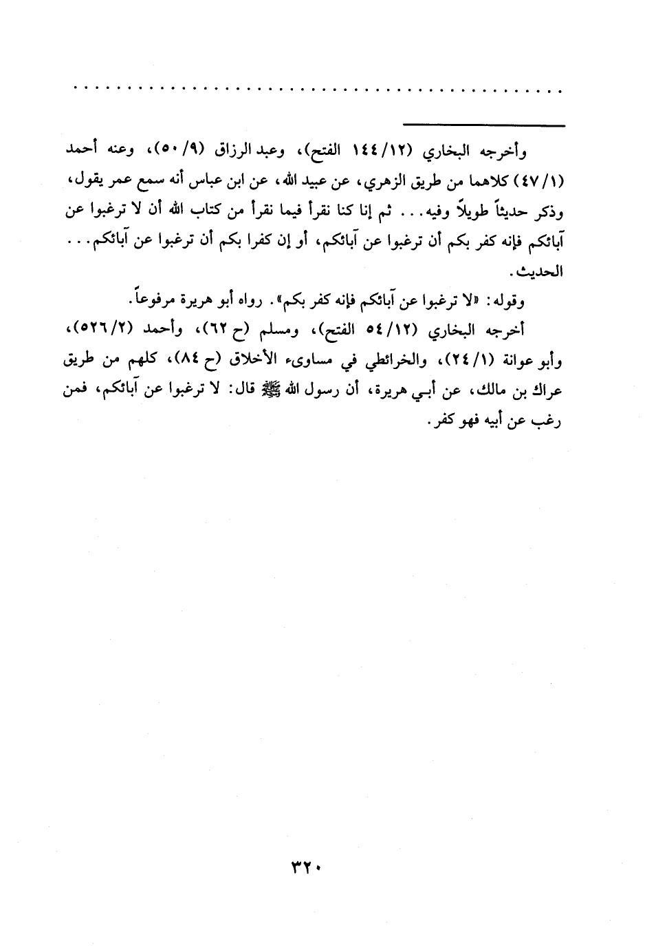 وقوله: "لَا تَرْغَبُوا عَنْ آبَائِكُمْ فَإِنَّهُ كُفْرٌ بِكُمْ". رواه أبو هريرة مرفوعًا.