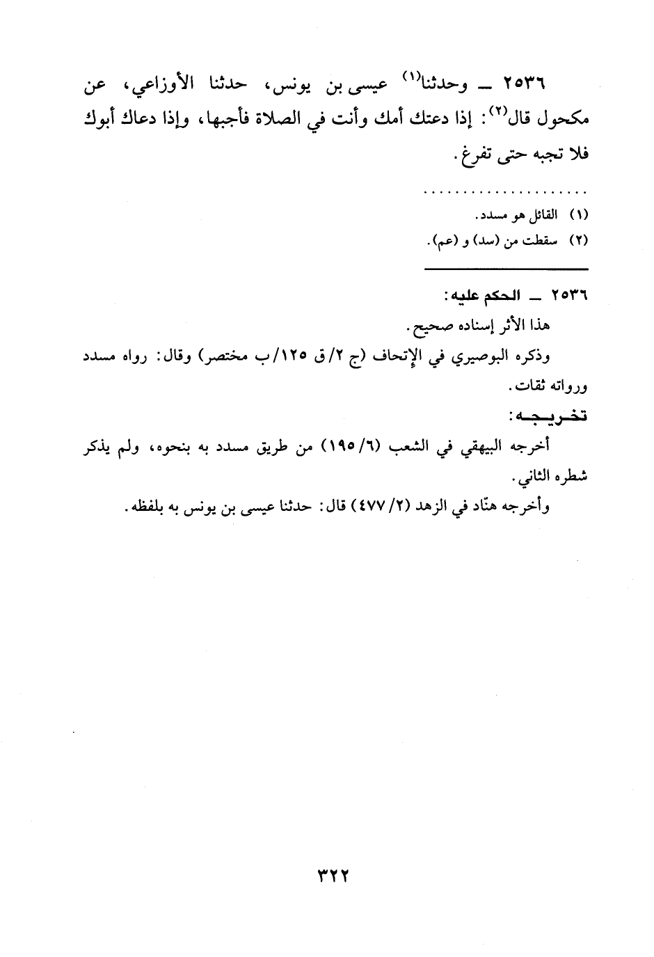 2536 - وَحَدَّثَنَا عِيسَى بْنُ يُونُسَ، حَدَّثَنَا الْأَوْزَاعِيُّ، عَنْ مَكْحُولٍ قَالَ: §إِذَا دَعَتْكَ أُمُّكَ وَأَنْتَ فِي الصَّلَاةِ فَأَجِبْهَا، وَإِذَا دَعَاكَ أَبُوكَ فَلَا تُجِبْهُ حَتَّى تَفْرُغَ.