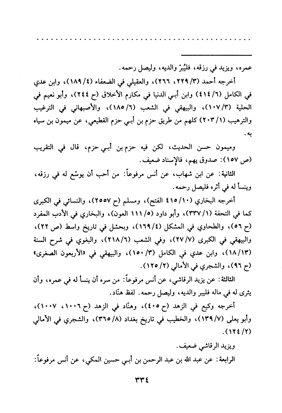 الثالثة: عن يزيد الرقاشي، عن أنس مرفوعًا: من سره أن ينسى له في عمره، وأن يثرى له في ماله فليبر والديه، وليصل رحمه. لفظ هنّاد.