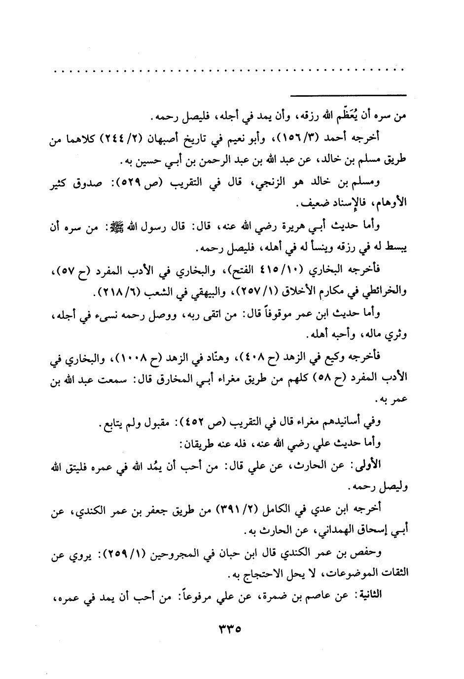 وأما حديث علي رضي الله عنه، فله عنه طريقان: الأولى: عن الحارث، عن علي قال: من أحب أن يمُد الله في عمره فليتق الله وليصل رحمه.