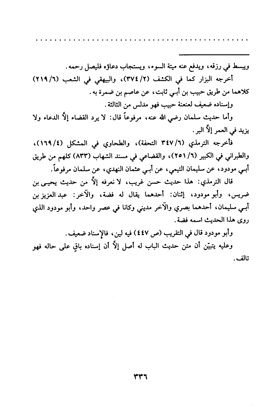 وأما حديث سلمان رضي الله عنه، مرفوعًا قال: لا يرد القضاء إلَّا الدعاء ولا يزيد في العمر إلَّا البر.