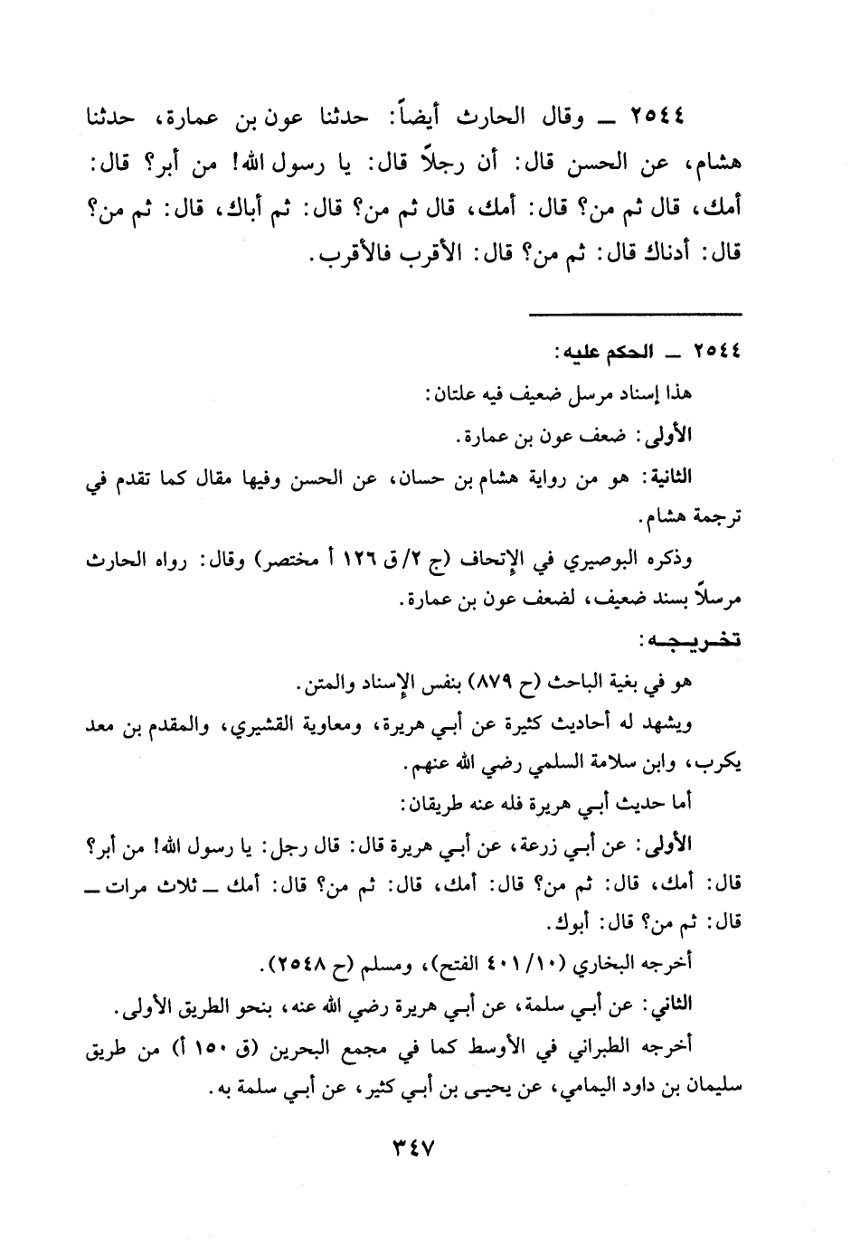 2544 - وَقَالَ الْحَارِثُ أَيْضًا: حَدَّثَنَا عَوْنُ بْنُ عُمَارَةَ، حَدَّثَنَا هِشَامٌ، عَنِ الْحَسَنِ قَالَ: أَنَّ رَجُلًا قَالَ: يَا رَسُولَ اللَّهِ! §مَنْ أَبَرُّ؟ قَالَ: أُمَّكَ، قَالَ ثُمَّ مَنْ؟ قَالَ: أُمَّكَ، قَالَ ثُمَّ مَنْ؟ قَالَ: ثُمَّ أَبَاكَ، قَالَ: ثُمَّ مَنْ؟ قَالَ: أَدْنَاكَ قَالَ: ثُمَّ مَنْ؟ قَالَ: الْأَقْرَبَ فَالْأَقْرَبَ.
